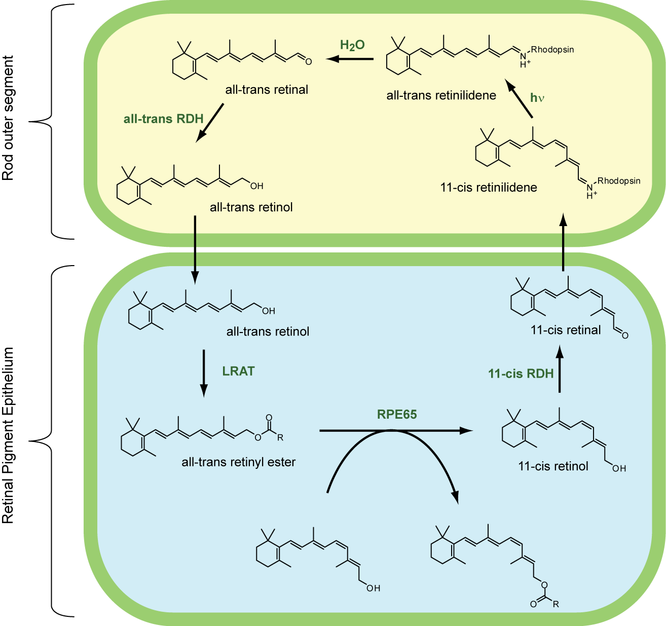 빛 정보를 전달하는 신호전달체계는 순환하는 효소 경로로 이루어져 있으며, 11-''시스''-레티날을 재생성한다. 포유동물 막대세포의 시각 주기는 다음과 같다.