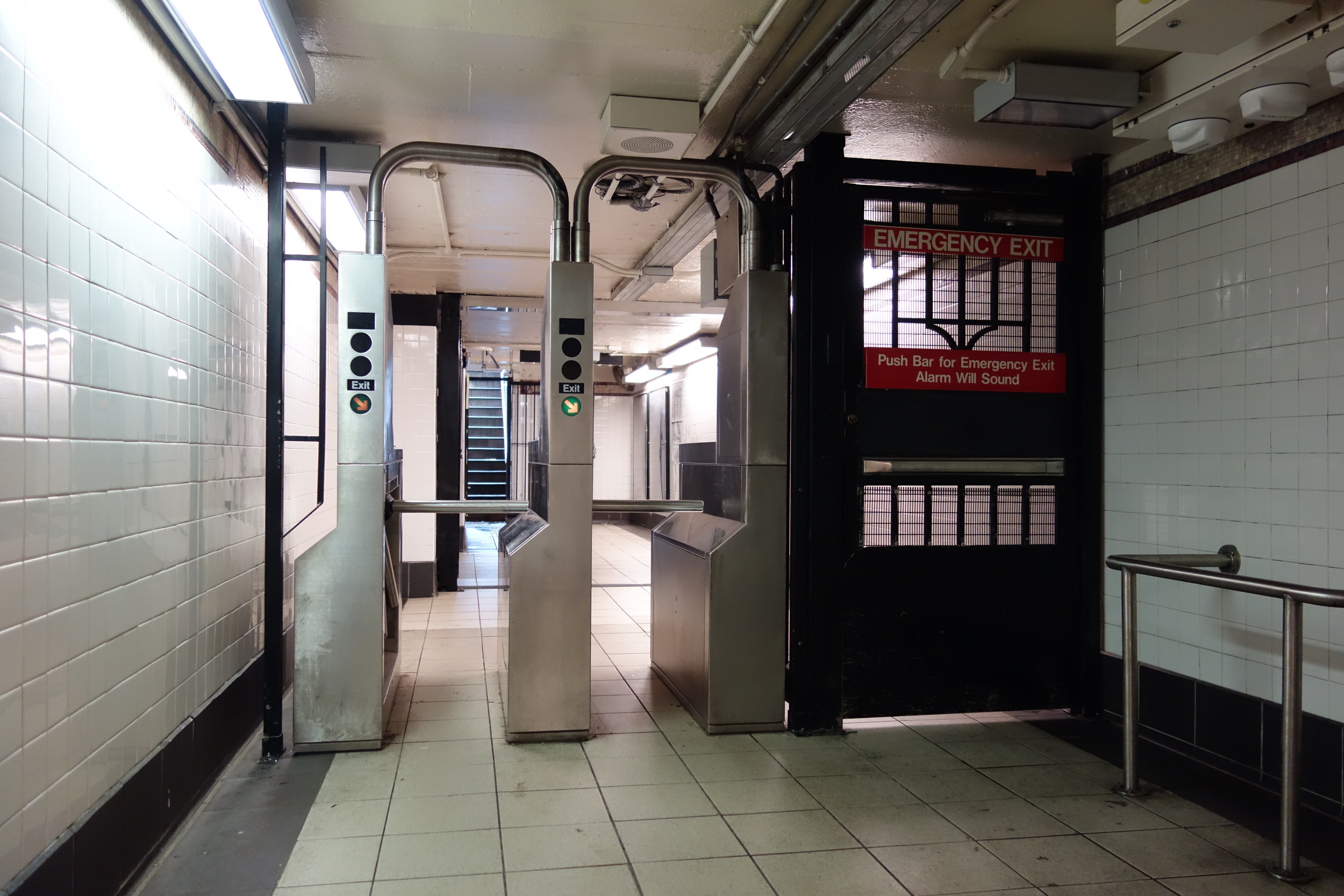 상행 승강장 북단 | 회전식 개찰기, 토큰 부스 | 그리니치 스트리트와 렉터 스트리트 교차로 북동쪽 (계단 1개) | [48][22] |