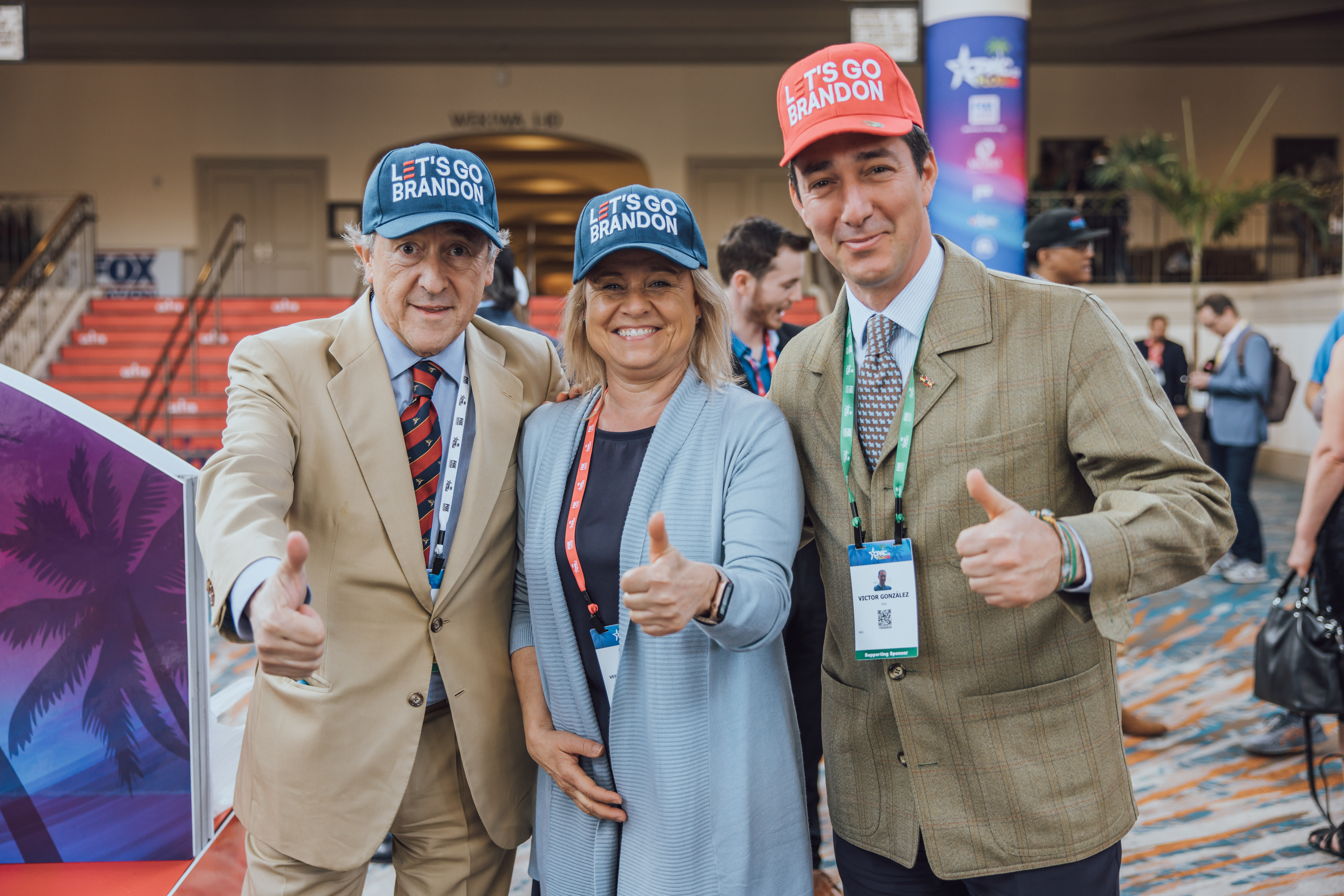 2022년 보수 정치 행동 회의(CPAC) 참석자들이 2020년 조 바이든 선거 로고 글꼴을 모방해 디자인된 "렛츠 고 브랜든" 모자를 쓰고 있다.