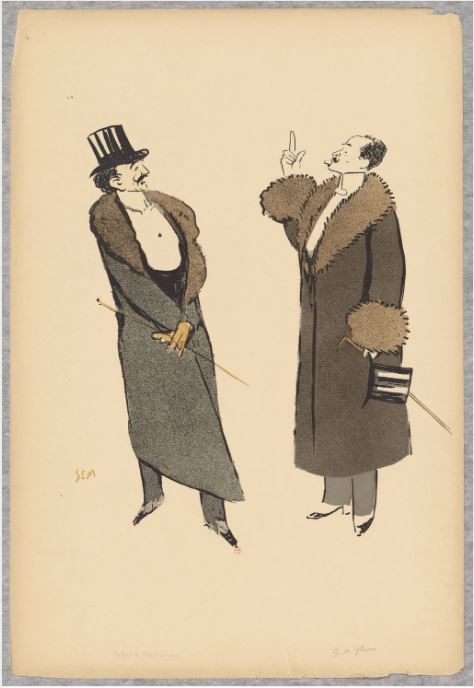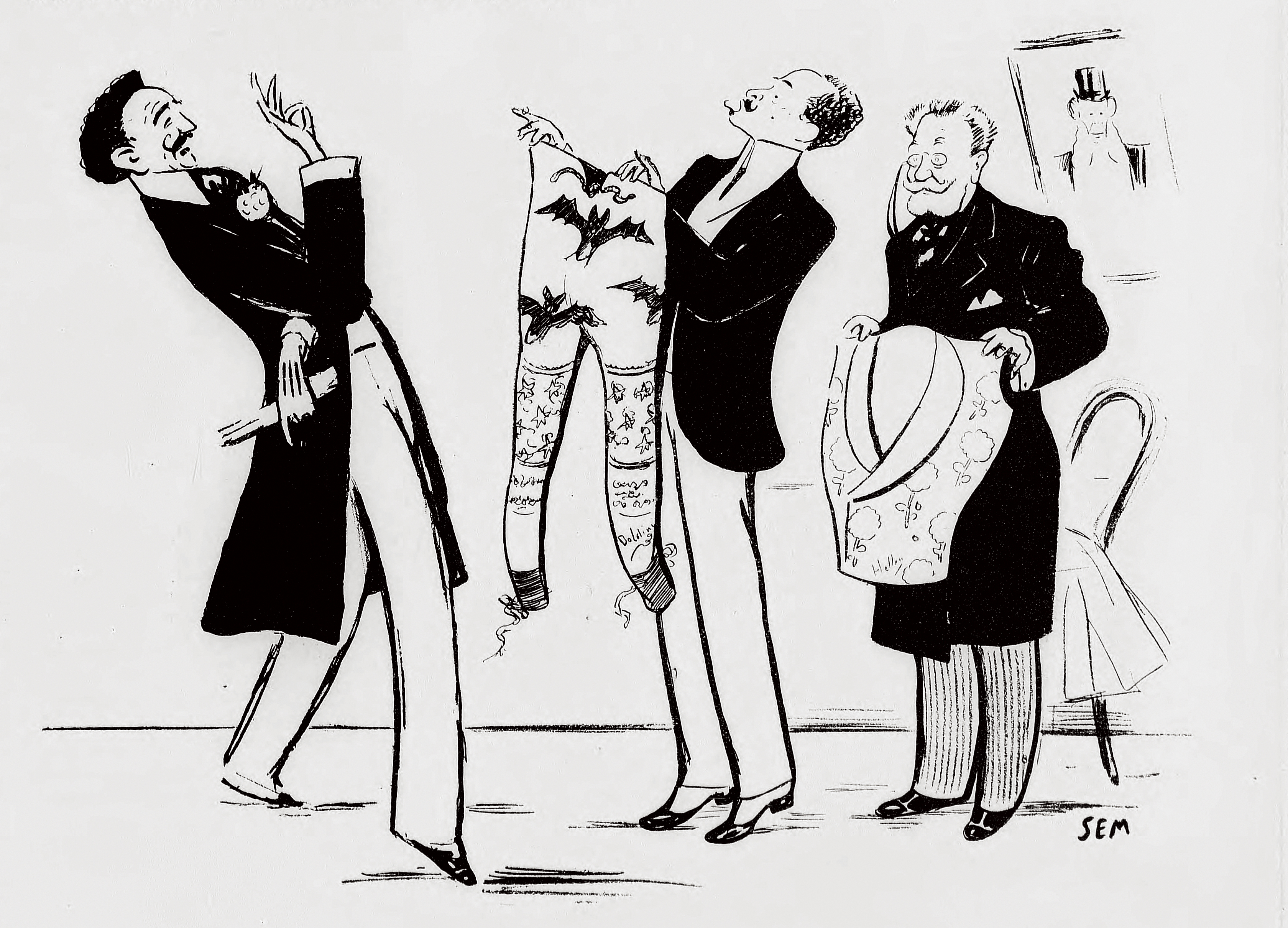 샤르베(오른쪽) 가게의 몽테스키우(왼쪽). 가운데에는 가브리엘 이투리가 몽테스키우에게 박쥐로 장식된 속옷을 건네고 있다(셈의 풍자화)