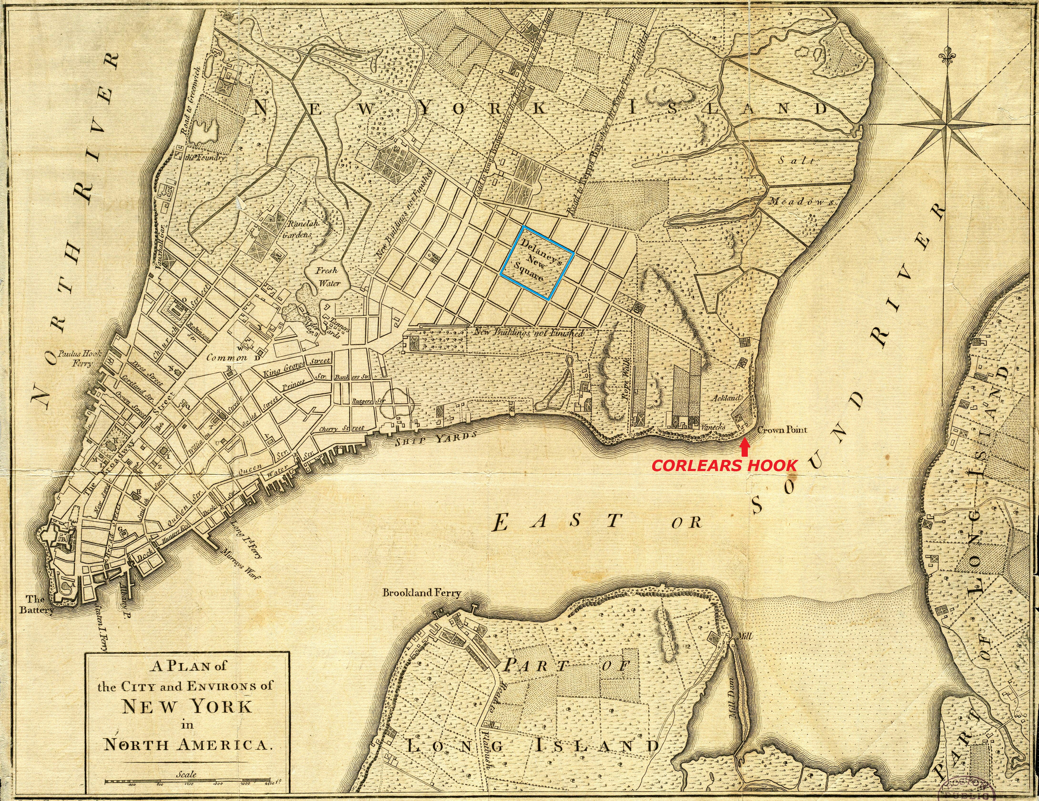이스트 강으로 돌출된 지역은 네덜란드와 영국 통치 시기 '코리어스 후크'(Corlaer's Hook)라고 불렸는데, 이는 초기 정착민의 이름에서 유래했다.[187][188] 독립 전쟁 중 잠시 '크라운 포인트'(Crown Point)로 불리기도 했다. 이 지역은 오랫동안 항해사들에게 중요한 지표였으며, 19세기 초부터는 'Corlears Hook'으로 표기되었다. 19세기에는 좋지 않은 평판을 얻기도 했으며, 1832년 콜레라 유행 시기에는 임시 병원이 설치되기도 했다.[193] 원래의 해안선은 매립으로 인해 희미해졌지만[194], 그 이름은 현재 FDR 드라이브 인근의 코리어스 후크 공원(Corlear's Hook Park)에 남아 있다.[195]