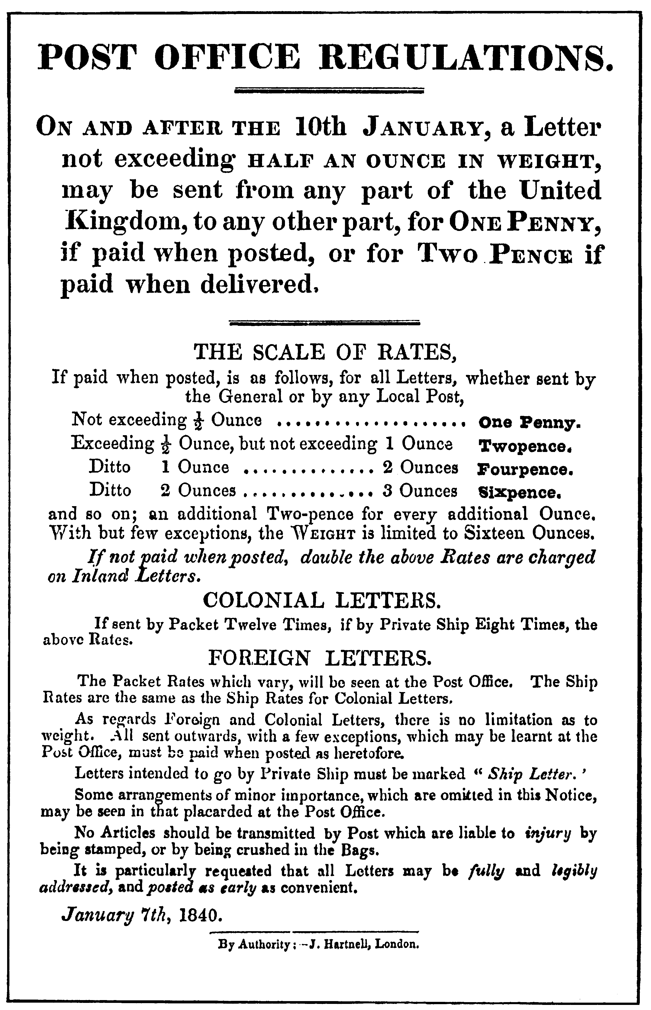본격적인 변화는 1840년 1월 10일 균일 페니 우편 제도가 도입되면서 시작되었다. 이 제도로 그레이트 브리튼 아일랜드 연합 왕국 내 어디로 보내든 무게에 따라 단일 요금을 적용했으며, 요금은 발신자가 미리 지불해야 했다.[23] 몇 달 뒤인 1840년 5월 6일부터는 요금 지불을 증명하기 위해 세계 최초의 접착식 우표인 페니 블랙을 우편물에 붙이기 시작했다.[24] 이와 함께 윌리엄 멀레디가 디자인한 그림이 인쇄된 선불 우편 문구(멀레디 문구)인 편지 시트와 봉투도 도입되었다.[25]