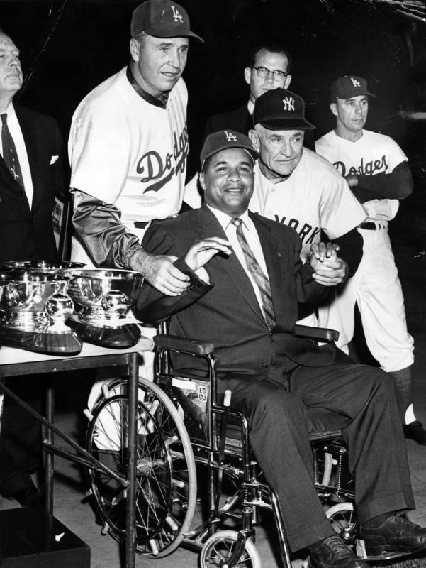 캄파넬라와 다저스 감독 월터 알스턴과 양키스 감독 케이시 스텡겔이 1959년 5월 LA 콜리세움에서 열린 "로이 캄파넬라의 밤" 행사에서 함께 있는 모습