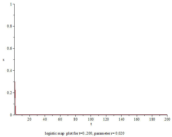 Logistic map영어에서 r 값에 따른 변화는 다음과 같다.- 0 < r ≤ 1: 모든 초기 조건에 대해 개체 수는 결국 0으로 수렴하여 멸종한다. 이는 r이 1보다 작을 때, 개체 수가 기하급수적으로 감소하기 때문이다.