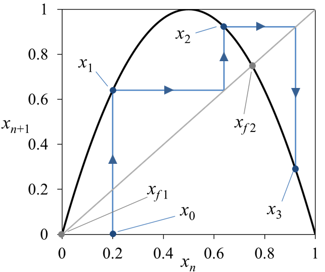 로지스틱 사상은 초기 상태 에 함수 를 반복 적용하여 나타낼 수 있다.