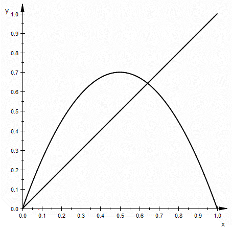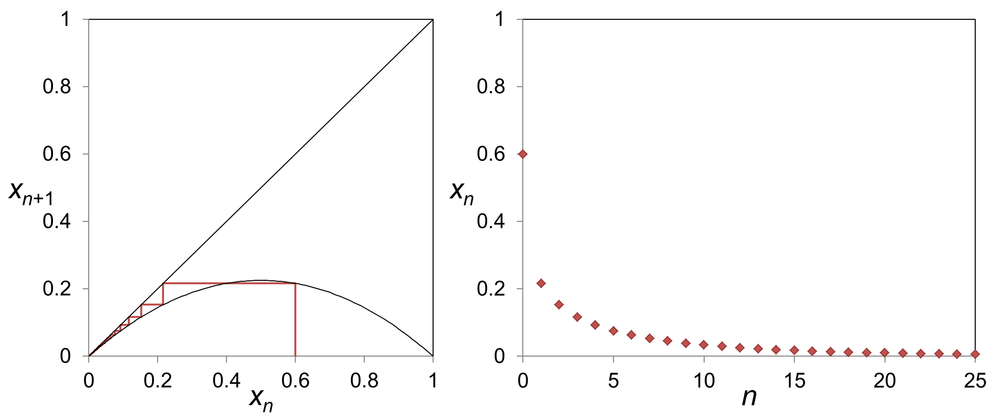 위 식에서 상수 와 변수 값을 정하고 를 계산한다. 얻어진 값을 새로운 값으로 식에 대입하여 반복 계산한다. 예를 들어, 를 2, 최초 를 0.01로 설정하고 5회 반복 계산하면 다음과 같다.