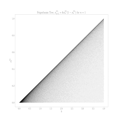 - 3.54409... < r < 3.56995...: r이 증가하면서 거의 모든 초기 조건에서 주기 2n의 주기점에 도달한다. 주기는 r이 증가하면서 두 배씩 증가(주기배가 분기)하며, 주기가 일정한 r의 구간 길이는 제1종 파이겐바움 상수 δ ≈ 4.669201609의 역수로 기하급수적으로 감소한다.