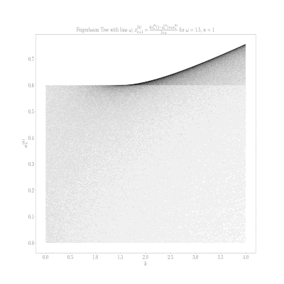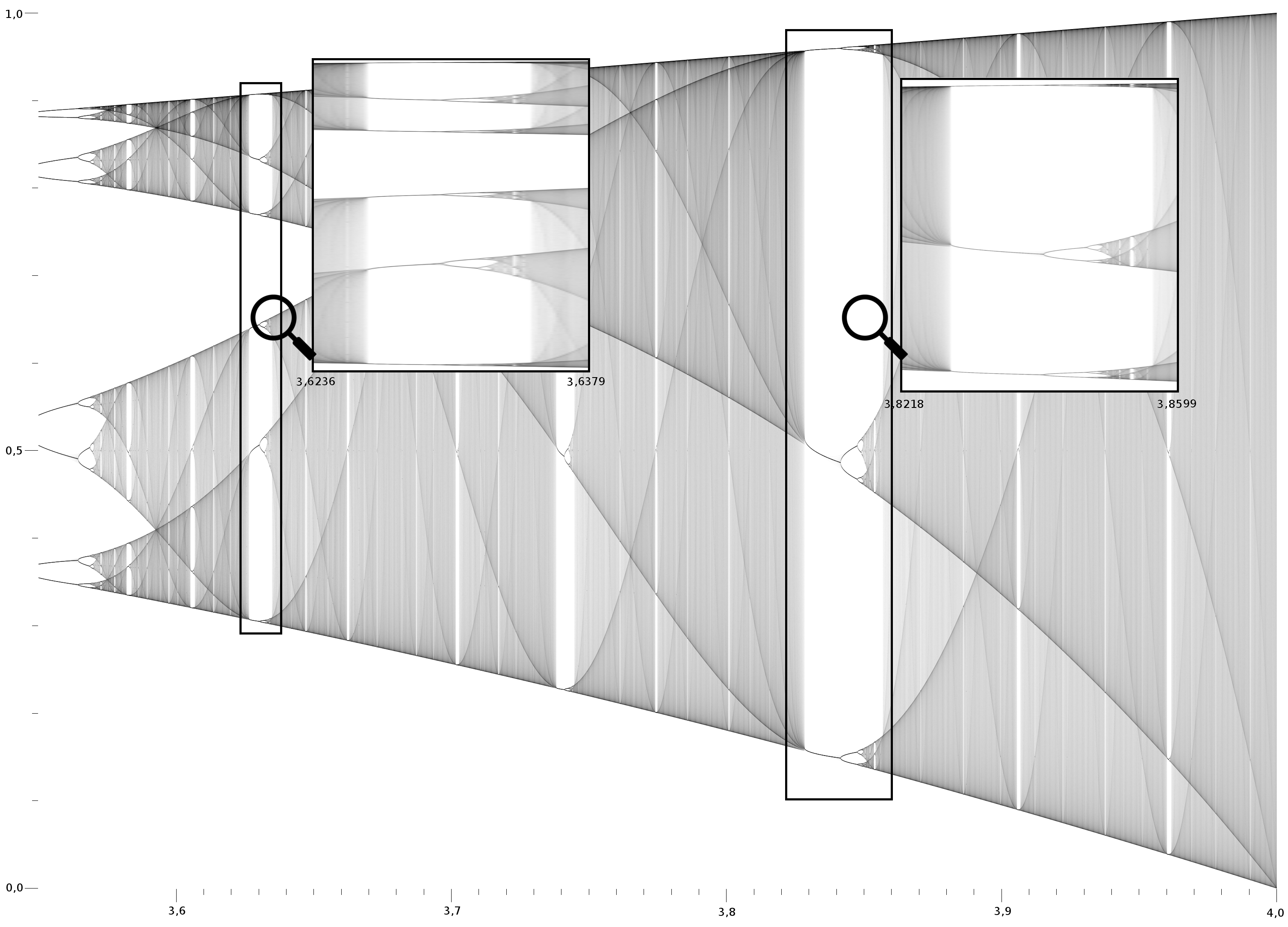 3.56995\le r<4 일 경우, 대부분의r 값들은 혼돈을 보인다. 거의 모든 초기 조건은 무한한 주기를 가진다.- 다만, 이 구간에서도 일부