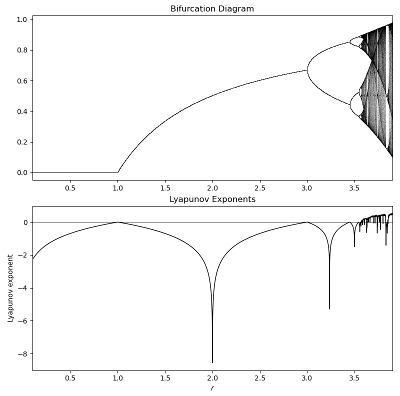 - r > 4: 거의 모든 초기 조건에서 개체 수는 ±∞로 발산한다.