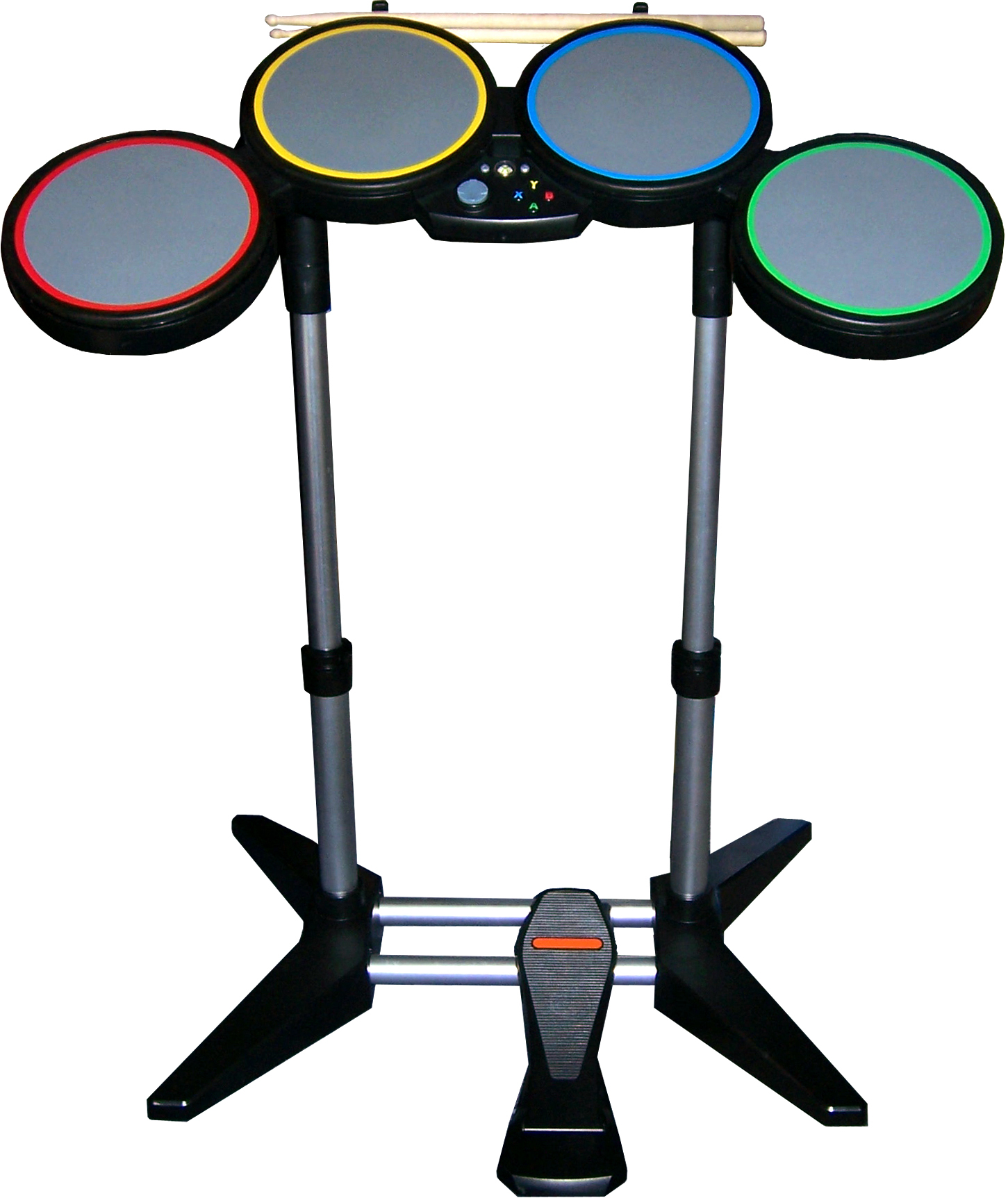 드럼 컨트롤러는 고무 드럼 패드 4개와 킥 페달로 구성되어 있다. 패드 가장자리에는 색상 고리가 있어 스네어 드럼(빨간색), 하이햇(노란색), 탐탐(파란색), 크래시 심벌(녹색)을 나타낸다. 킥 페달은 베이스 드럼을 시뮬레이션하며, 주황색 수평선으로 표시된다. 드럼 컨트롤러에는 정품 드럼 스틱 한 쌍이 포함되어 있다.[13][21]