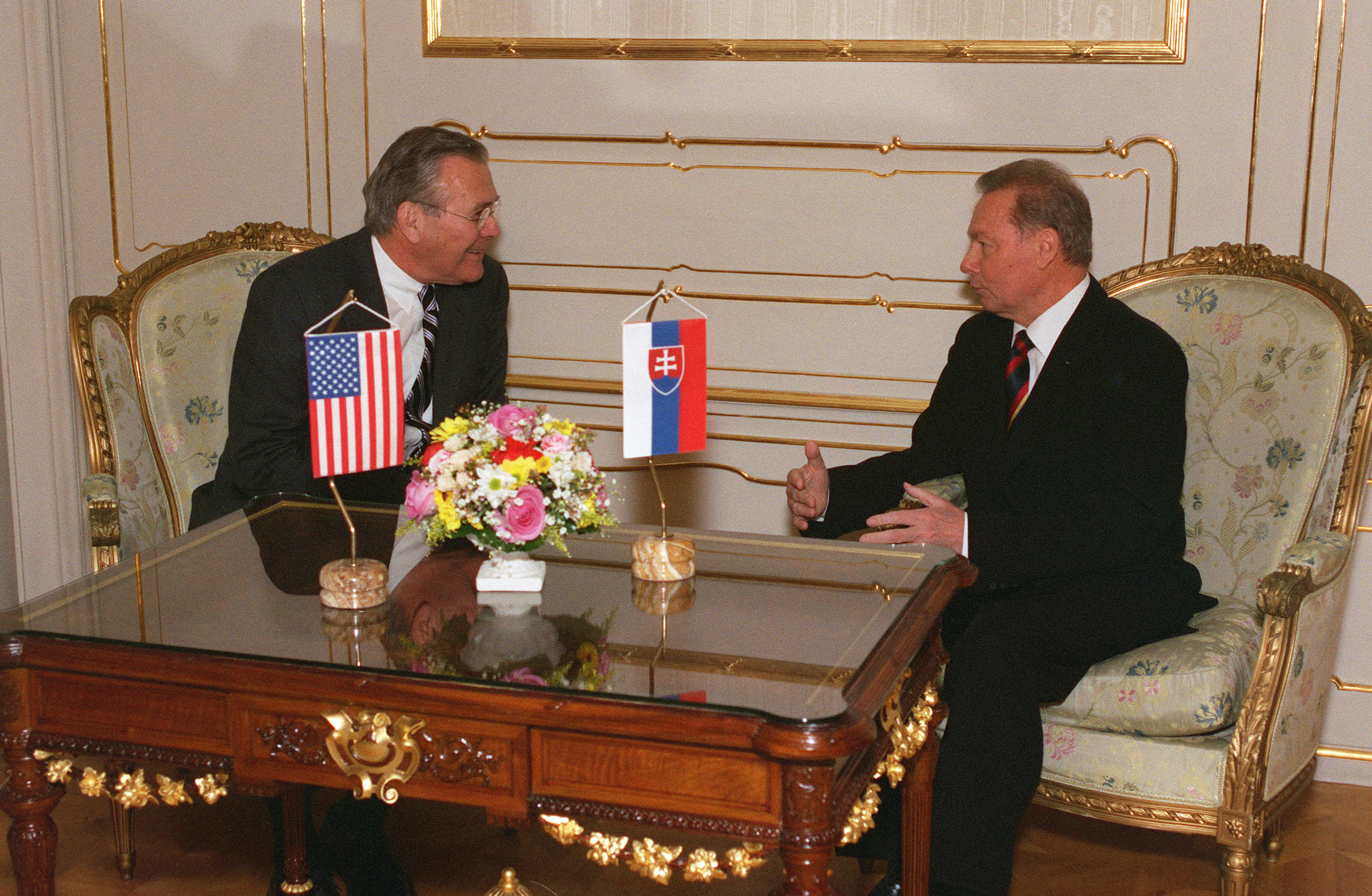 2002년 11월 22일 브라티슬라바 대통령궁에서 도널드 럼즈펠드 미국 국방장관이 슬로바키아 대통령 루돌프 슈스터와 만나는 모습