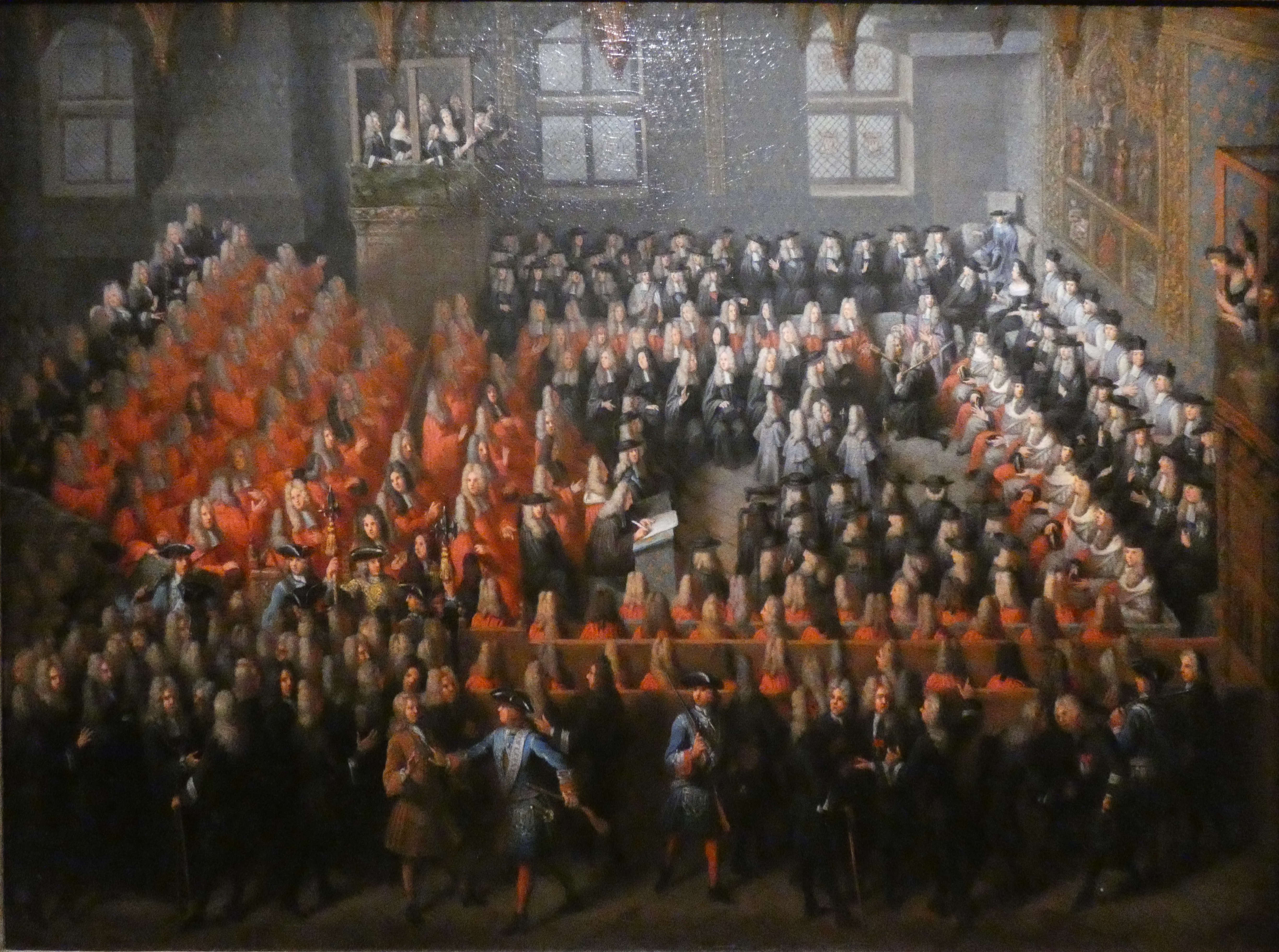 어린 루이 15세가 주재한 사법 재판 (lit de justice), 옆에는 방타두르 부인이 앉아 있다.