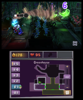 루이지가 유령을 잡고 있는 모습. 성공적으로 포획하려면, 플레이어는 유령의 체력이 0이 될 때까지 진공 청소기로 빨아들여야 한다. 터치 스크린은 플레이어가 탐험하고 있는 현재 저택의 위치를 보여준다.