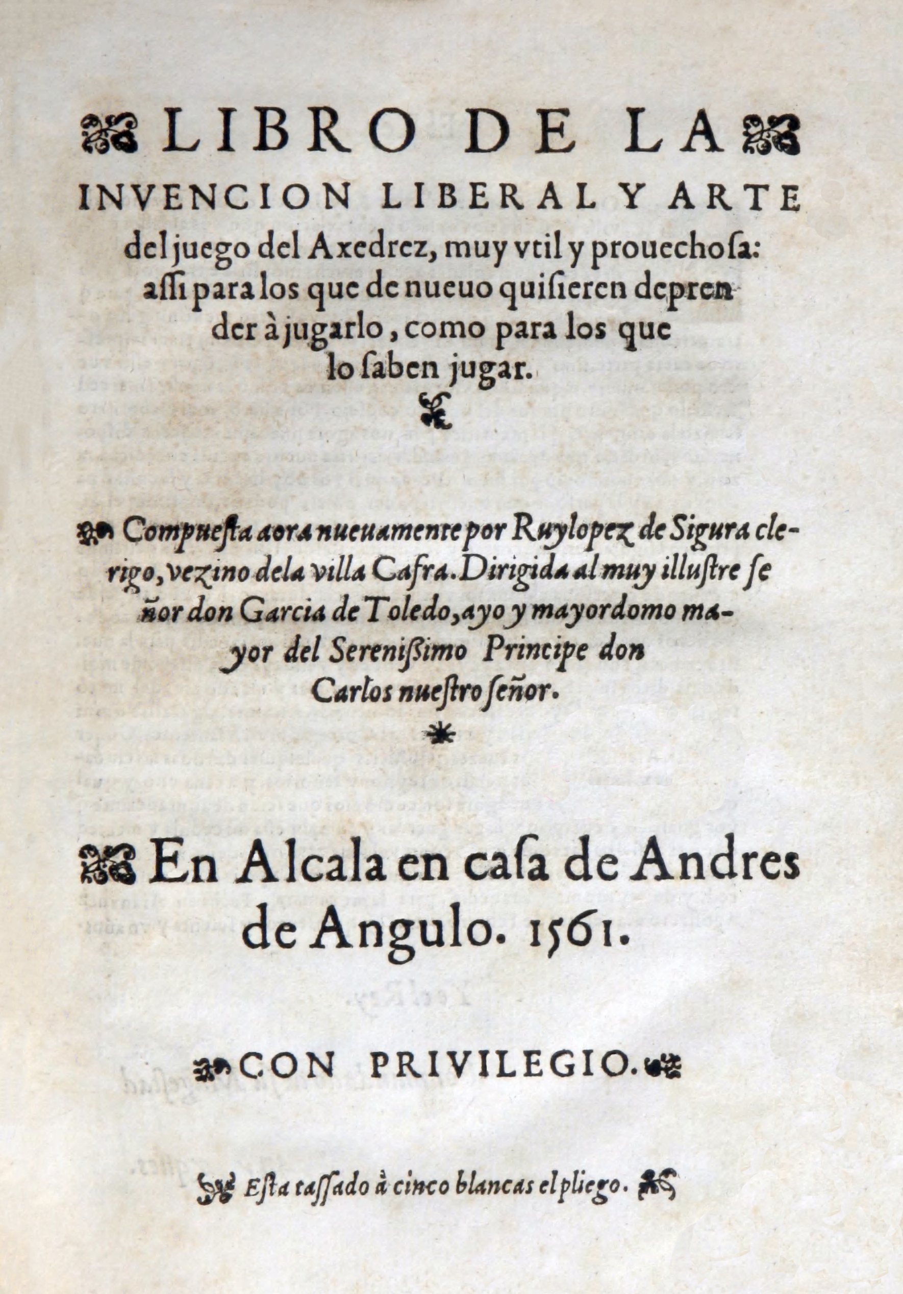 루이 로페스 데 세구라가 1561년에 출판한 책의 정식 명칭은 ''Libro de la Invencion liberal y Arte del juego del Axedrez, por Ruy-López de Sigura, clerigo, vezino de la villago Cafra. Digirida al muy Illustre Señor Don Garcia de Toledo, ayo y mayordomo del serenissimo principe Don Carlos nuestro Señor.''이다.