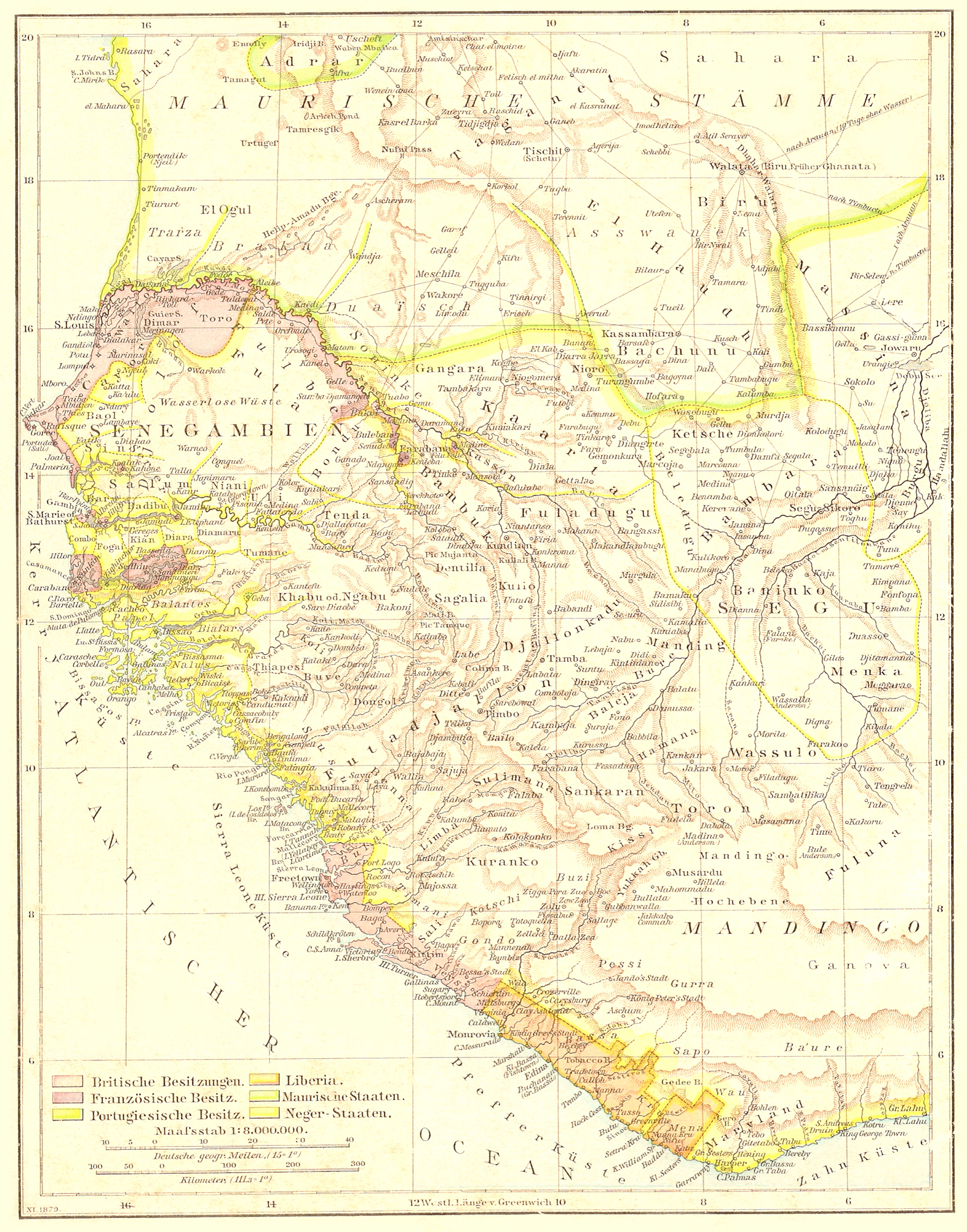 브리에르 드 리즐의 재임 기간이 끝날 무렵인 1881년의 세네감비아. 분홍색 지역은 프랑스 제국에 병합되었으며, 주변 영토의 대부분은 프랑스 "보호령"이다.