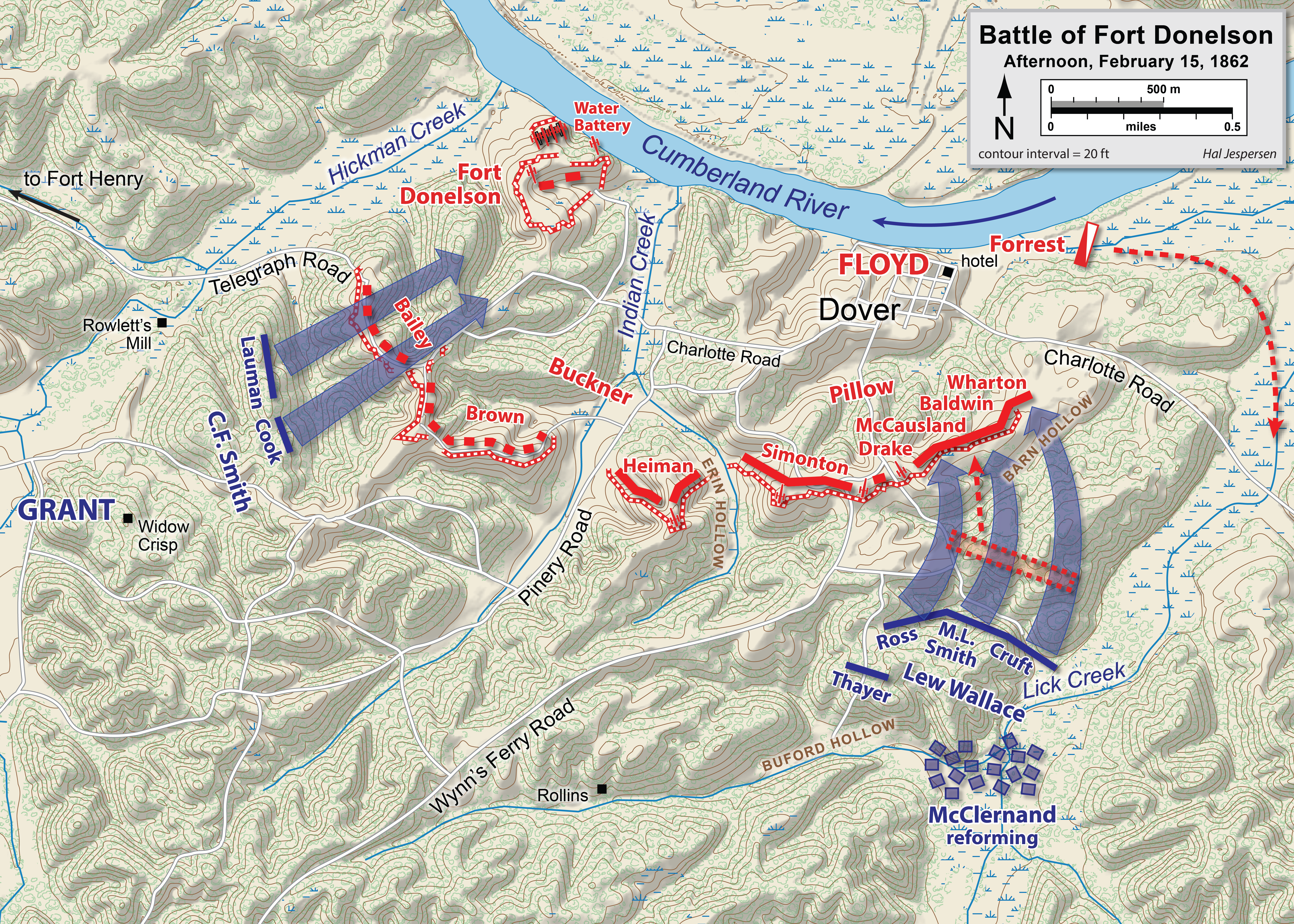 그랜트의 상관인 헨리 W. 할렉 소장은 연합군이 도넬슨 요새로 육로로 이동할 때 남군 증원군이 두 요새를 탈환하려 할 것을 우려하여 윌리스에게 헨리 요새를 지휘하게 하여 요새를 안전하게 지키도록 했다.[40][41] 뒤처진 것에 불만을 품은 윌리스는 즉시 이동할 수 있도록 부대를 준비시켰다. 2월 13일 자정에 명령이 내려졌고, 다음 날 윌리스는 도넬슨 요새 앞에 도착하여 새로 창설된 제3 사단의 지휘를 맡게 되었다. 사단의 많은 병사들은 시험을 거치지 않은 증원군이었다.[42] 윌리스의 세 개 여단은 도넬슨 요새를 마주보며 연합군 전선의 중앙에 자리를 잡았다.[40]
