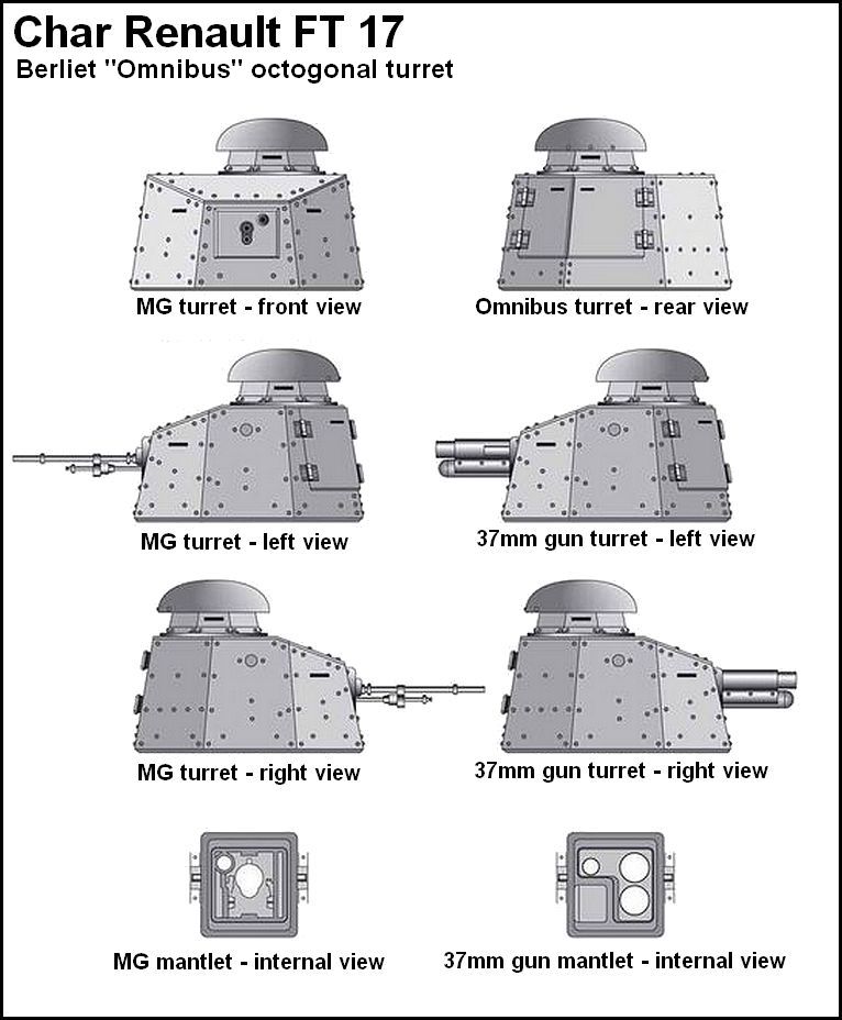 - FT-17 기관총 전차: 오치키스 8mm 기관총 탑재형으로, 생산된 전차의 약 2/5를 차지한다.[81][82][83][84][85]