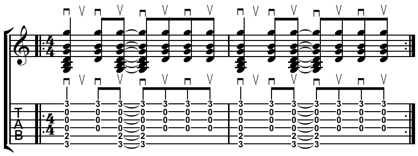 - 재즈: 초기 재즈에서 기타는 밴조를 대체하여 리듬 코드 반주 역할을 수행했다. 재즈 기타리스트는 화성학에 대한 깊은 지식을 바탕으로 다양한 코드 보이싱을 사용하며, 코드의 3음과 7음을 강조한다.[4] 빅 밴드에서는 기타리스트가 리듬 섹션의 일원으로 한 마디에 4개의 코드를 연주하는 것이 일반적이었으며, 카운트 베이시 오케스트라의 기타리스트 프레디 그린이 대표적이다. 스몰 그룹에서는 기타리스트가 '컴핑'이라는 간결한 반주 스타일을 사용한다. 집시 재즈에서는 '라 폼프(la pompe)'라는 특별한 스트로크 주법을 사용하는데, 이는 빠른 상-하 스트로크 다음에 하 스트로크를 하는 방식이다.[5]