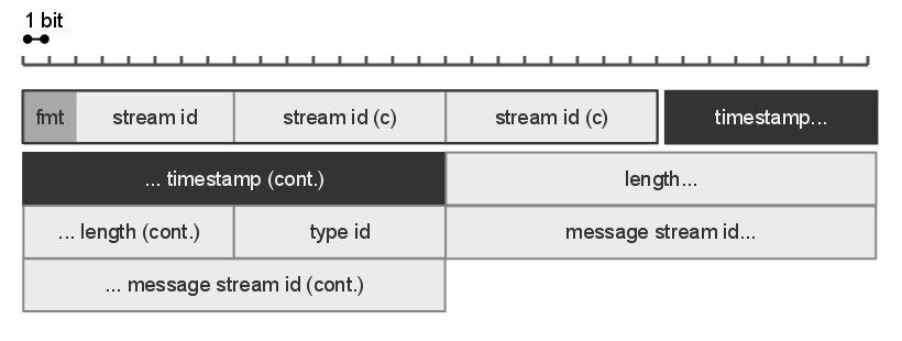 패킷은 기본 헤더(0x03)로 시작하며, 청크 헤더 유형(0)과 청크 스트림 ID(3)를 나타낸다. 헤더 유형은 다음과 같이 4가지가 있다.