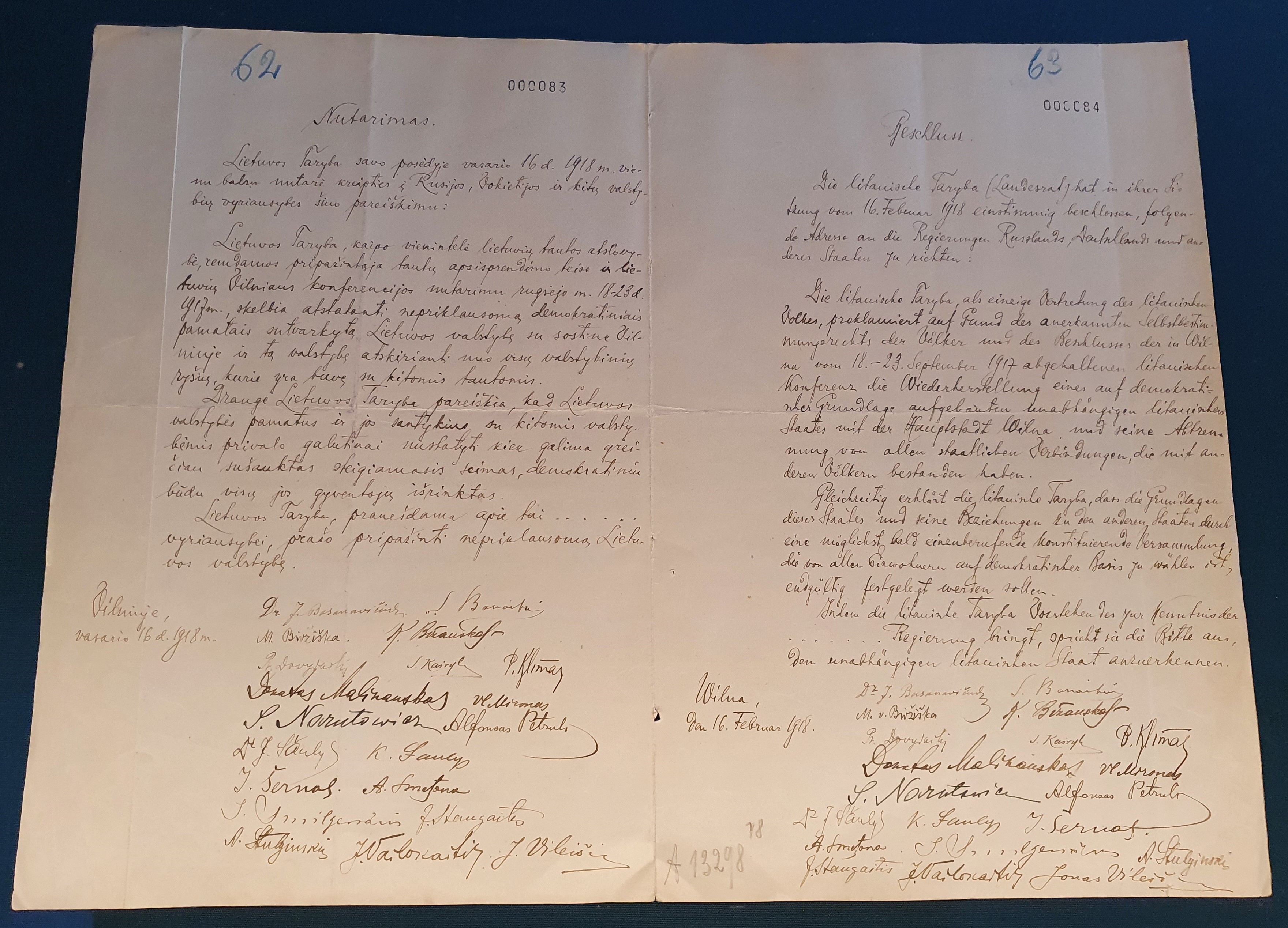 2022년에 전시된 리투아니아 독립 선언문의 리투아니아어(왼쪽) 및 독일어(오른쪽) 원본 필사본