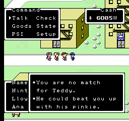 전투에서 승리하면 경험치를 얻어 캐릭터 레벨을 올릴 수 있고, 능력치 상승 및 새로운 초능력을 습득할 수 있다. 적을 물리치면 아이템을 얻거나, 닌텐의 아버지가 ATM에서 인출 가능한 돈을 입금해 주기도 한다. 마을에서는 패스트푸드점, 백화점 등에서 물건을 구매하고, 펜던트, 메달, 반지 등의 장비로 캐릭터를 강화할 수 있다. 병원 등 유용한 시설도 이용 가능하다.