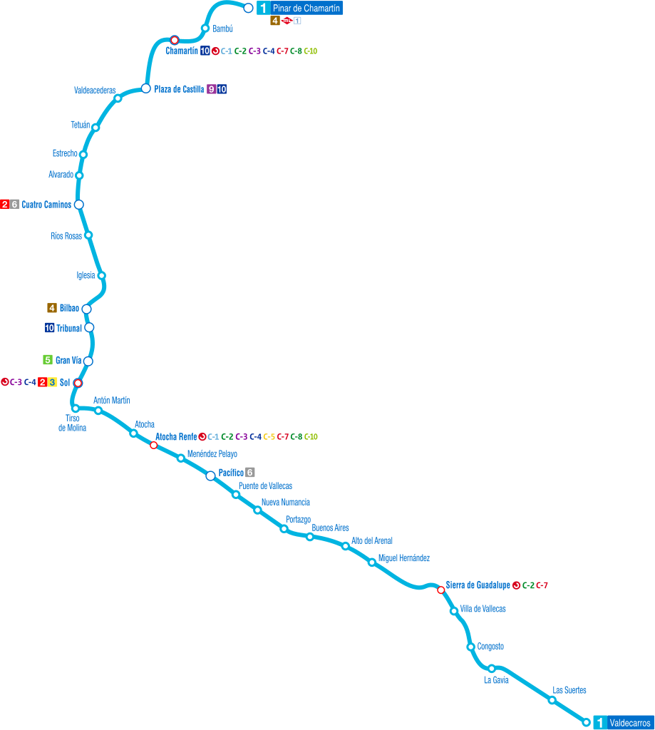 1호선은 참베리, 테투안, 레티로, 푸엔테데바예카스, 비야데바예카스, 센트로 구역을 지난다.