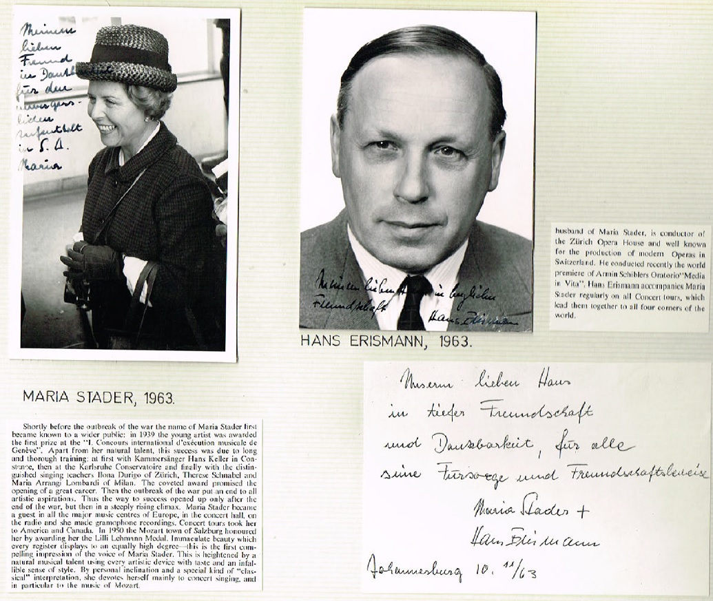 마리아 슈타더는 1939년 바인펠덴의 음악 감독이자 나중에는 취리히 오페라 하우스의 합창단 감독이었던 한스 에리스만과 결혼했다. 그녀는 성악 선생님인 마틸데 베를로허의 남편을 통해 스테피 가이어 부부를 만났는데, 가이어는 부다페스트 출신으로 1920년에 취리히로 이주하여 슈타더의 경력을 지속적으로 지원했다. 1935년에는 부다페스트 출신의 일로나 두리고가 취리히에서 그녀의 성악 선생님이 되었다.