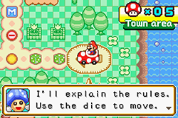 플레이어는 "키노코 카"라는 자동차를 타고 주사위 블록을 쳐서 나온 수만큼 칸을 이동한다. 이번 작품에서는 주사위 블록으로 나온 수만큼 원하는 길로 키노코 카를 이동할 수 있으며, 이동이 끝나면 멈춘 칸에 따라 이벤트가 발생한다.[10] 분홍색 화살표가 있는 곳에서 A 버튼을 누르면 건물이나 시설 안으로 들어갈 수 있으며, "퀘스트"가 발생하기도 한다. 건물이나 시설에 들어간 경우, 남은 이동 횟수가 남아 있어도 이동이 종료된다. 퀘스트를 완료하면 파티 아이템이나 미니 게임을 얻을 수 있다.[12]키노코 카는 "버섯"을 연료로 사용하며, 버섯을 소비하여 주사위 블록을 치므로, 버섯이 모두 없어지면 게임 오버가 된다. 게임 시작 시 버섯은 5개를 가지고 시작한다. 3번 이동할 때마다 "혼자서 하는 미니 게임"이 시작되며, 미니 게임을 클리어하면 버섯 3개를 얻을 수 있다 (드물게 6개를 얻을 수도 있다). 버섯은 최대 99개까지 소지할 수 있다.