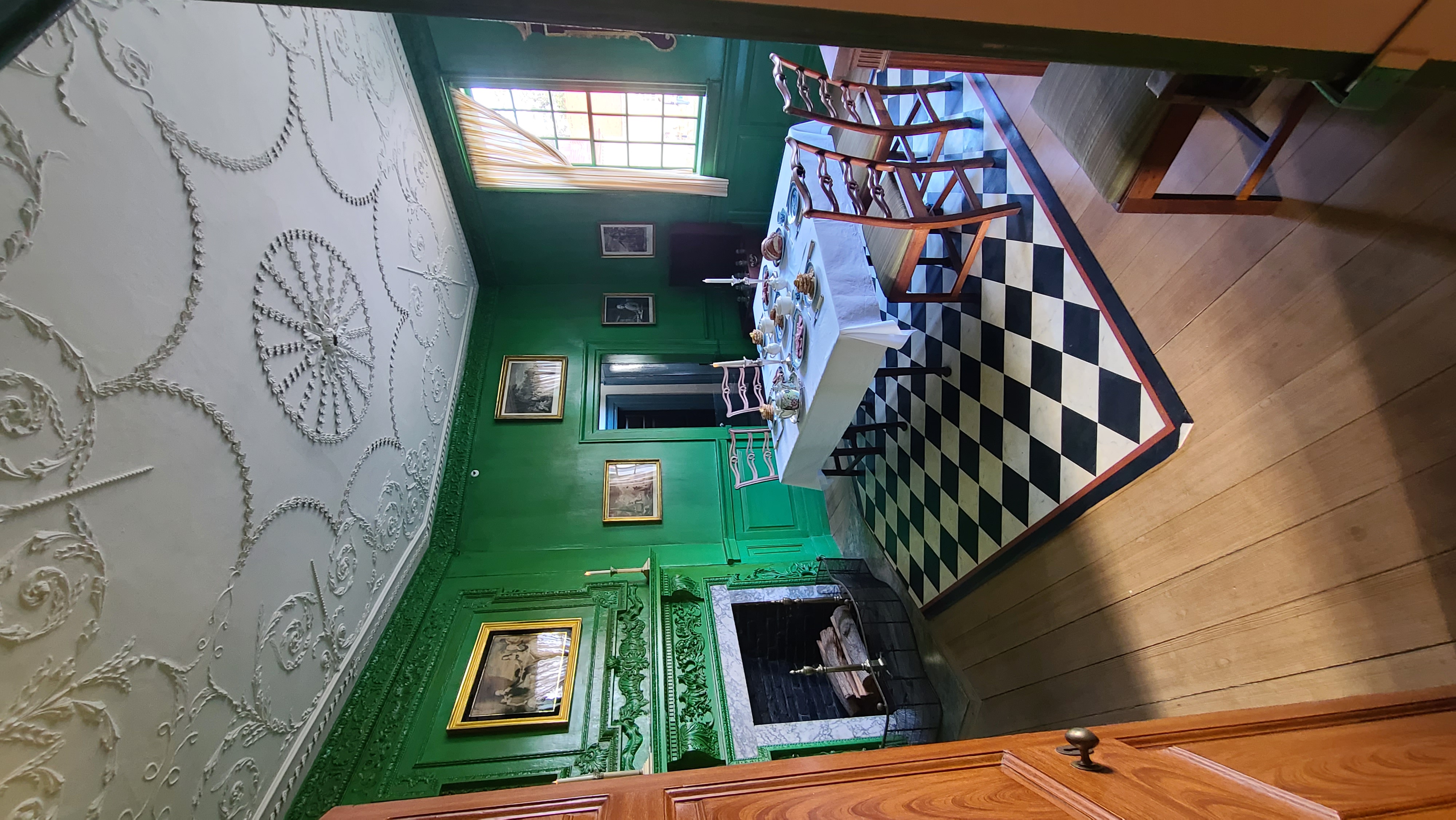 조지 워싱턴의 마운트 버넌 식당, 독특한 색상(구리 페인트 사용), 화려한 천장 장식으로 유명