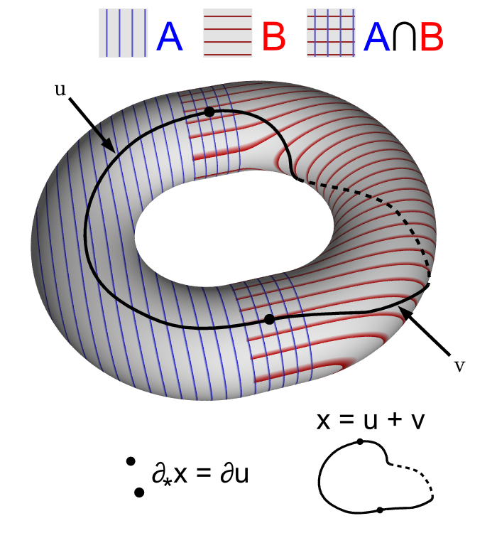 ∂x = ∂(u + v) = ∂u + ∂v이다. x는 사이클이므로 ∂x = 0이고, 따라서 ∂u = -∂v이다. 이는 두 경계 (n - 1)-사이클의 이미지들이 교차점 A∩B에 포함됨을 의미한다.