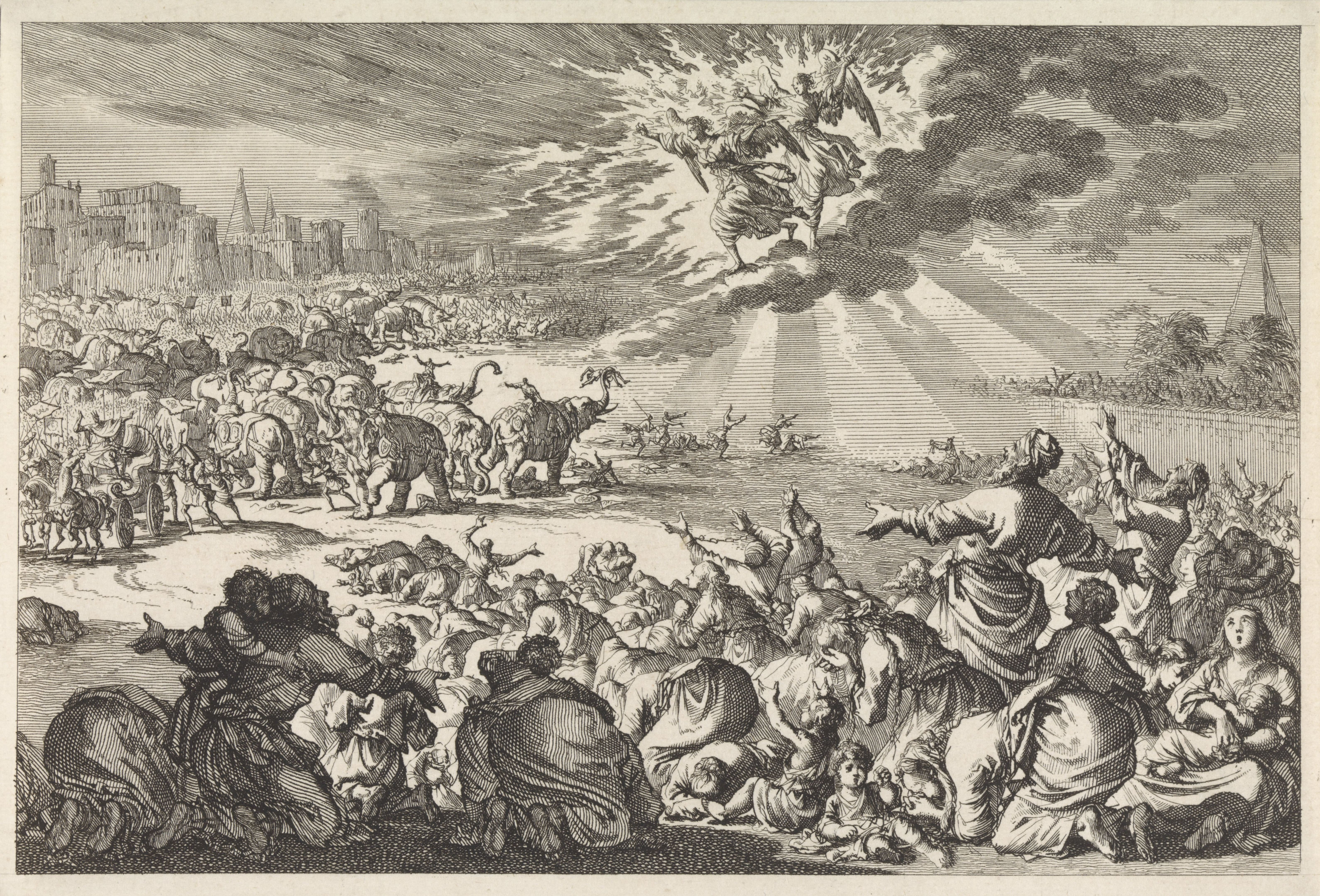 프톨레마이오스 4세 필로파토르가 술 취한 코끼리로 유대인들을 죽이려 하자 유대인들이 기도하고 두 천사에 의해 구원받는 모습 (마카베오 3서 5장); 네덜란드 판화