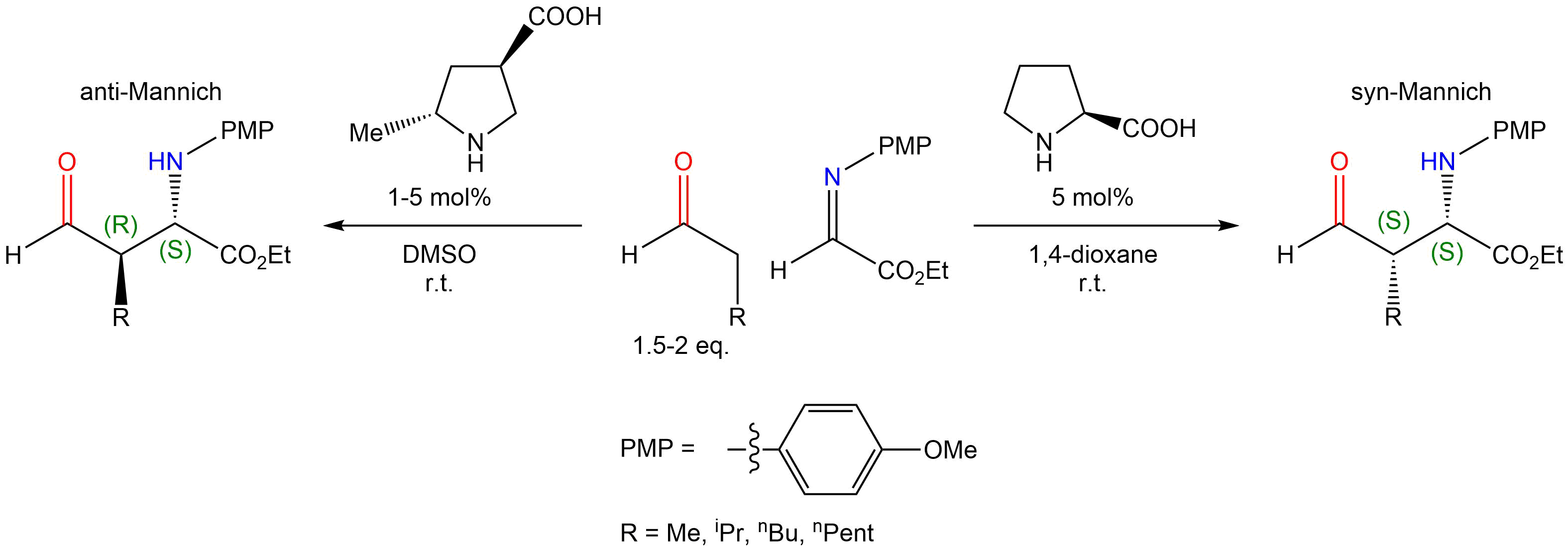 (''S'')-프롤린은 키랄 촉매로서 비대칭 만니히 반응을 촉매한다. 이는 더 큰 알데히드 치환체를 가질수록 효과가 커지며, syn 부가물에 대해 입체선택성을 나타내며, (''S'', ''S'') 부가물에 대해 거울상 선택성을 나타낸다.[7] 치환된 프롤린은 대신 (''R'', ''S'') anti 부가물을 촉매할 수 있다.[8]만니히 반응에 의해 두 개의 불균등 탄소가 새롭게 생성되므로 4종류의 입체 이성질체가 생성물로 생각할 수 있다. 그러나 촉매로 L-프롤린을 첨가하면 고 선택적으로 불균등 탄소의 제어를 할 수 있다(R1=Me, R2=COOEt, 99% ee).[15] L-프롤린의 경우, 신형의 불균등 만니히 반응이 일어난다.