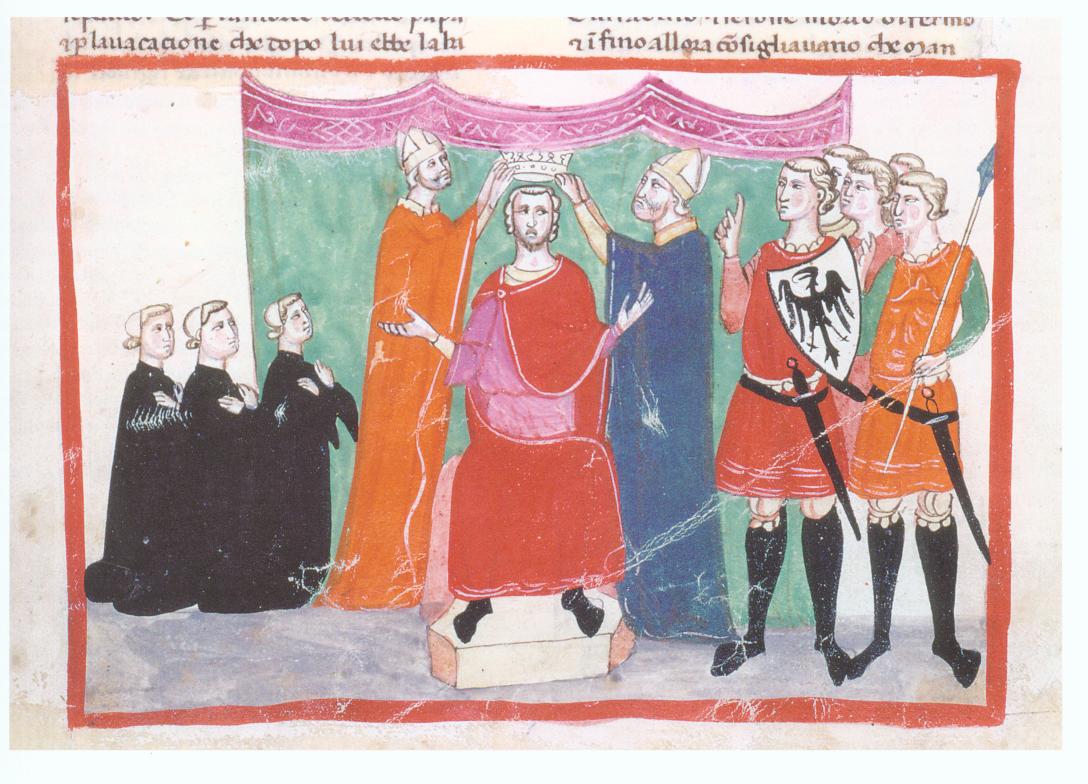 1258년 8월 10일, 조카 콘라딘이 죽었다는 소문이 퍼진 가운데, 만프레디는 팔레르모에서 시칠리아의 왕으로 즉위했다. 이 소문은 사실이 아니었지만, 만프레디는 민중의 지지를 받으며 왕위를 내놓지 않고 계속 시칠리아를 다스렸다. 교황은 그의 왕위를 인정하지 않았고, 만프레디는 퇴위를 거부하며 콘라딘의 사절에게 강력한 토착 통치자의 필요성을 지적했다. 사라센과의 동맹이 심각한 위협이라고 여긴 교황은 만프레드의 대관을 무효라고 선언했다.[1]