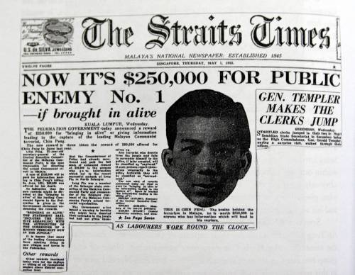아시아·태평양 전쟁 종전 후, 말레이시아 공산당(MCP)의 라이트 총서기가 일본군 협력자였다는 사실이 밝혀져 지위를 잃고 천핑이 새로운 총서기가 되었다.[113] 영국은 말레이시아에 복귀하면서 MCP에 무장 해제를 요구했지만, MCP는 인도 공산당의 영향을 받아 1948년 3월 중앙위원회를 열어 무장 투쟁 노선을 채택하고 영국과 충돌했다. 1948년 6월 17일, 영국 식민지 정부는 말레이시아 전역에 비상사태를 선포했고, 공산 게릴라들은 정글에 숨어 농촌의 화교 공동체의 지원을 받으며 반영 투쟁을 계속했다.[113]