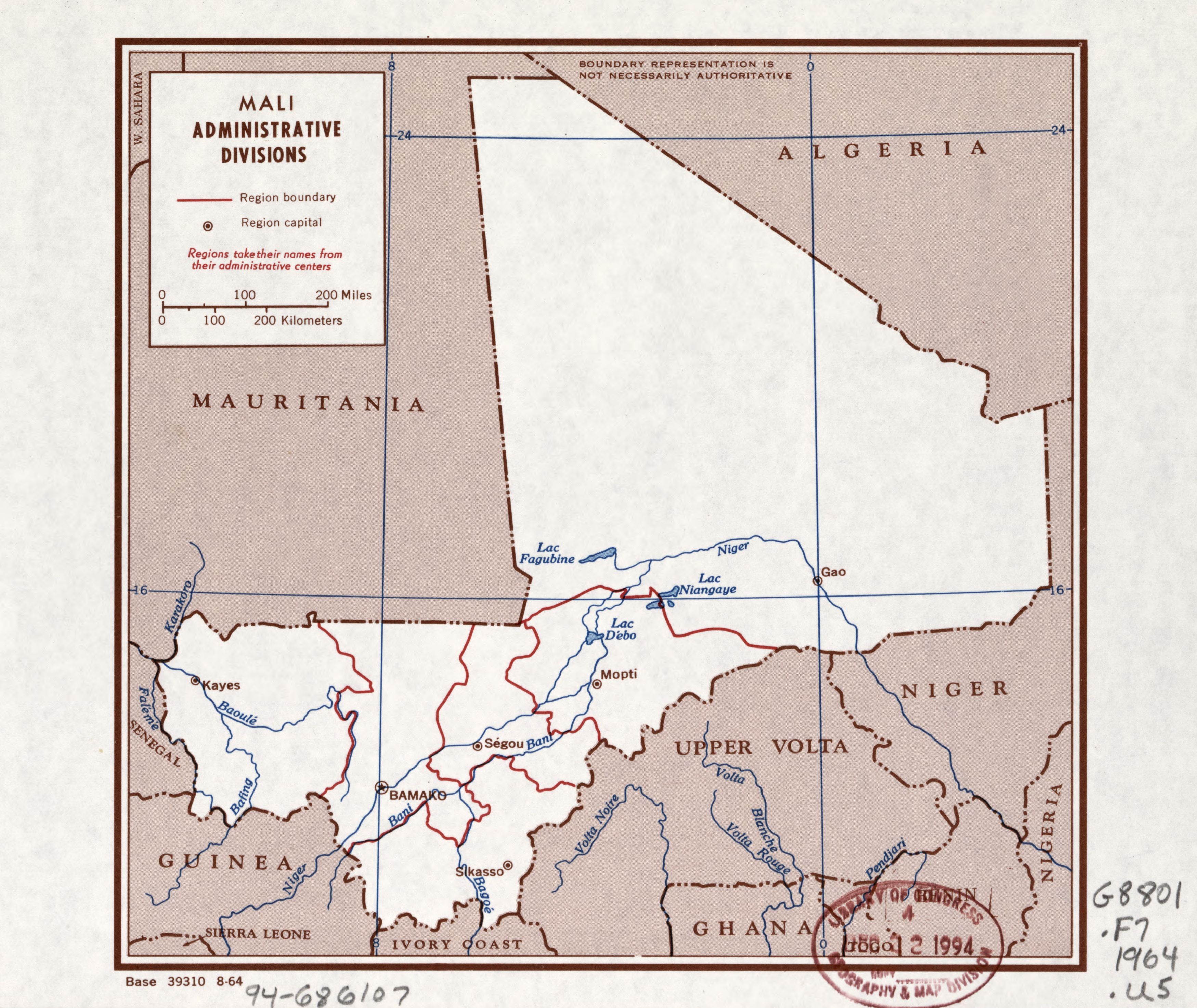 프랑스 공동체 내에서 자치 공화국으로 성립된 수단 공화국은 1960년 6월 7일에 새로운 지방 행정법(N°60-5/AL-RS)을 채택했다. 이 법은 행정 구획을 주(Région), 권(Cercle), 군(Arrondissement), 코뮌(Commune), 마을(Village)로 나누고, 부족 지역에는 플락시옹(Fraction)을 설치하도록 규정했다. 같은 날 채택된 다른 법률에서는 주를 민사적 인격과 재정적 자율성을 가진 공공 기관으로 정의했다.[9]수단 공화국은 세네갈과 함께 말리 연방을 결성하여 1960년 6월 20일 프랑스로부터 독립했다. 그러나 이 연방은 세네갈의 탈퇴로 인해 불과 2개월 만에 붕괴되었고, 같은 해 9월 22일 수단 공화국은 국호를 말리 공화국으로 변경했다. 연방이 해체될 당시, 수단 공화국에는 6개의 주, 6개의 권, 그리고 2가지 종류로 나뉘는 13개의 코뮌이 있었다.[9]