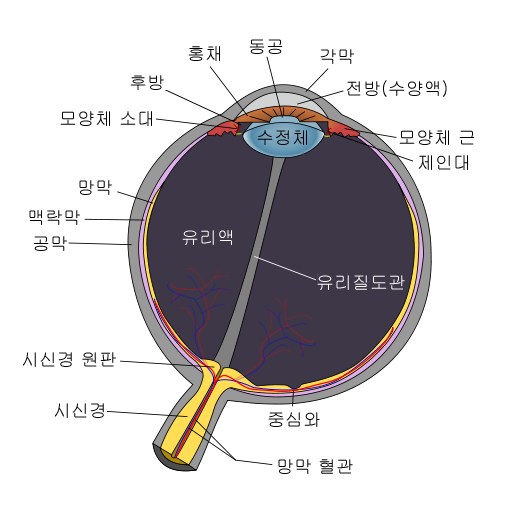 망막은 눈의 가장 안쪽에 위치한 얇은 신경 조직으로, 시각 정보를 처리하는 중요한 역할을 한다. 망막은 신경 세포와 신경교세포로 구성되어 있으며, 고등 척추동물에서는 중심와라는 부위가 시각 해상도가 가장 높다. 망막은 빛을 감지하여 전기 신호로 변환하는 시세포(간상체와 원추체)를 포함하며, 척추동물과 두족류의 망막 구조는 다르다. 망막은 10개의 층으로 구성되어 있으며, 혈액은 망막의 기능에 필수적인 영양분을 공급한다. 망막과 관련된 질환으로는 망막색소변성증, 황반변성, 망막박리 등이 있으며, 유전자 치료와 인공 망막 개발을 통해 치료법이 연구되고 있다.