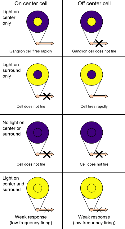 망막 신경절 세포에는 세포의 수용 영역에 따라 두 가지 유형의 반응이 있다. 망막 신경절 세포의 수용 영역은 중앙의 거의 원형 영역으로 구성되며, 여기서 빛은 세포 발화에 하나의 영향을 미치고, 고리 모양의 주변 영역에서는 빛이 반대 효과를 냅니다. ON 세포의 경우 수용 영역 중앙의 광 강도 증가는 발화율을 증가시킨다. OFF 세포의 경우 감소시킨다. 선형 모델에서 이 반응 프로필은 가우스 차로 잘 설명되며 에지 검출 알고리즘의 기초가 된다. 이러한 단순한 차이점 외에도 신경절 세포는 색상 감도와 공간적 합계의 유형에 따라 차별화된다. 선형 공간적 합계를 보이는 세포를 X 세포(소세포, P 또는 난쟁이 신경절 세포라고도 함)라고 하고, 비선형 합계를 보이는 세포를 Y 세포(대세포, M 또는 우산 망막 신경절 세포라고도 함)라고 하지만, X 세포와 Y 세포(고양이 망막)와 P 세포와 M 세포(영장류 망막) 사이의 대응은 예전만큼 간단하지 않다.