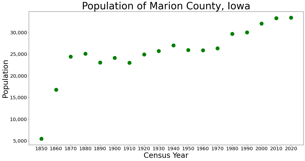 2020년 인구 조사에 따르면 매리언군의 인구는 33,414명이며, 14,073가구 중 13,145가구가 거주하고 있었다.[1]
