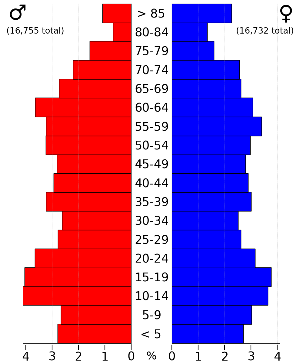 12,017가구 중 33.00%가 18세 미만의 자녀와 함께 살고 있었고, 61.20%가 함께 사는 부부였으며, 6.90%가 남편 없이 여성 가구주였고, 29.00%가 비가족이었다. 전체 가구의 25.60%는 개인으로 구성되었으며, 11.90%는 65세 이상인 사람이 혼자 살고 있었다. 가구당 평균 규모는 2.50명이었고, 가족당 평균 규모는 3.02명이었다.