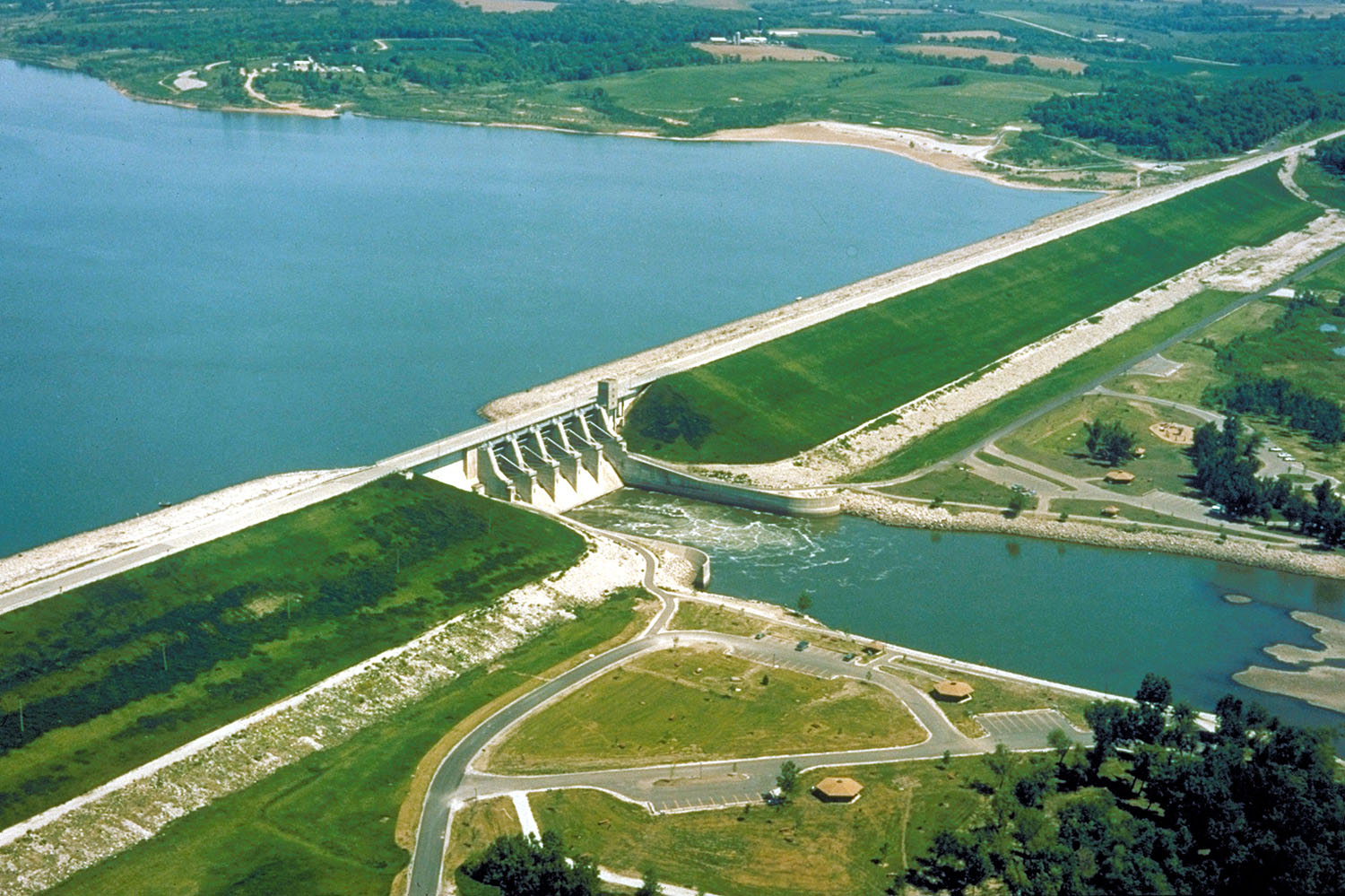 펠라 인근 매리언 군의 레드 록 호수와 댐. 엘크 록 주립공원은 호수 양쪽에 위치해 있으며 북서쪽에 위치해 있다. 카운티 도로 T15가 댐을 가로지른다.