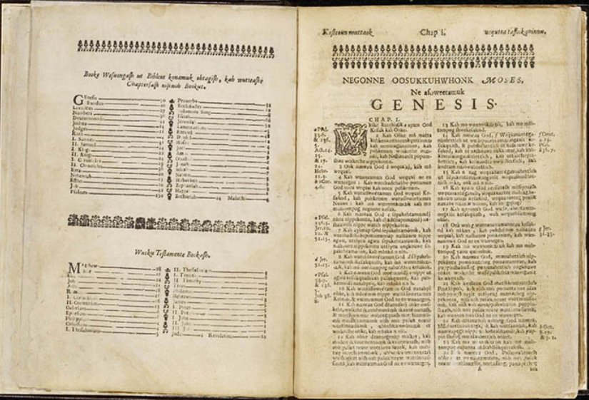 1663년 엘리엇이 매사추세츠의 내틱 방언으로 번역한 성경 창세기의 색인 및 첫 페이지, ''Mamusse Wunneetupanatamwe Up-Biblum God''