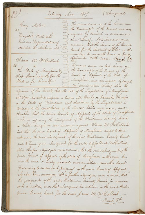 판결 | 연방 헌법은 의회에 은행을 설립할 권한을 구체적으로 부여하지 않았지만, 세금을 부과하고 지출할 수 있는 권한을 위임한다. 은행은 정부가 세입을 징수하고 지출하는 데 도움이 되는 적절하고 적합한 수단이므로, 연방법이 주법보다 우위에 있으므로 메릴랜드는 은행에 세금을 부과하여 은행 운영을 방해할 권한이 없다. 메릴랜드 항소 법원 파기. |