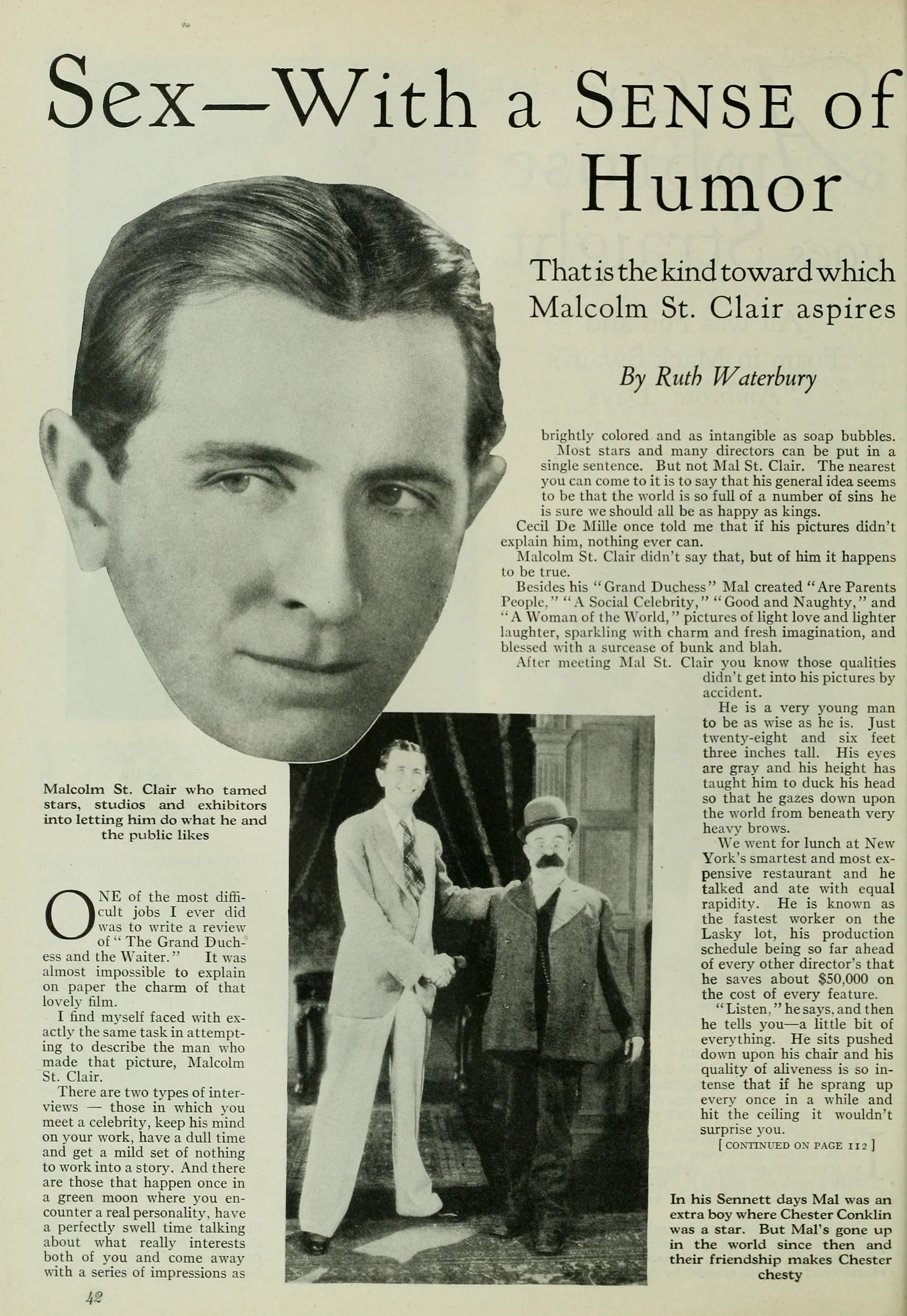 맬컴 세인트 클레어는 코미디 영화 제작자 맥 세넷과 트라이앵글-키스톤 스튜디오에서 5년 동안 일했으며, 이 기간 동안 그의 경력 전반에 걸쳐 사용할 기본적인 영화 제작 기법의 대부분을 익혔다.[6]