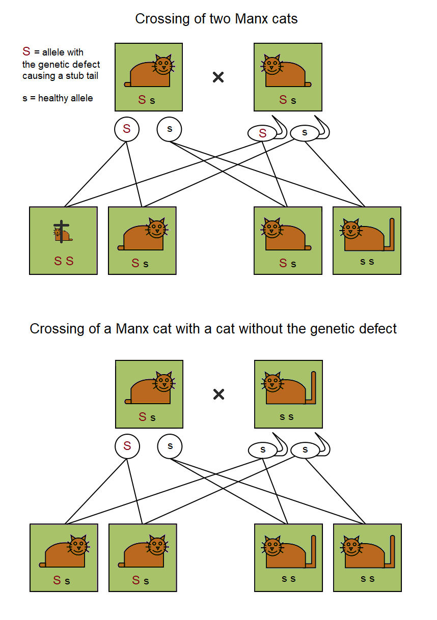 맹크스 유전자는 매우 우성이기 때문에, 맹크스와 교배한 다른 품종 고양이가 (주인이 모르는 사이에) 꼬리 없는 새끼를 낳을 수 있다는 믿음도 있었다.