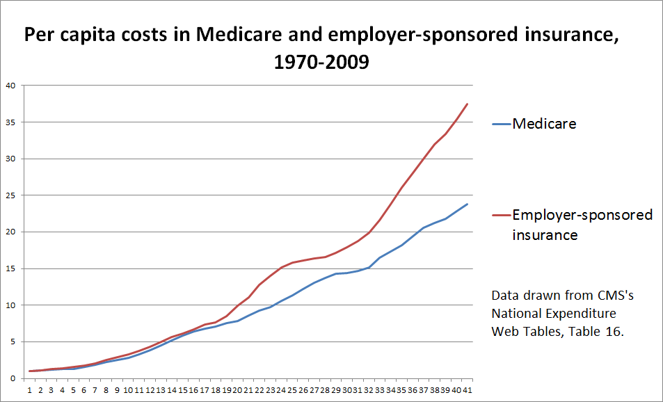 적색 선은 고용주가 일부 또는 전부 부담하는 민간 보험의 지출 증가, 청색 선은 메디케어의 지출 증가