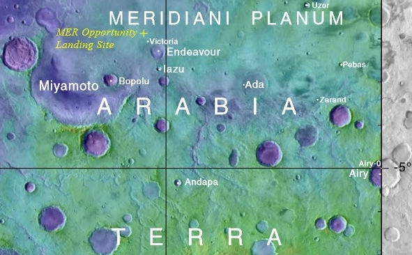 2004년 NASA는 화성 탐사 로버 오퍼튜니티를 메리디아니 평원에 착륙시켰다. 이곳은 원래 마스 폴라 랜더와 마스 클라이메이트 오비터의 실패로 중단된 Mars Surveyor 2001 Lander영어의 착륙 예정지였다.