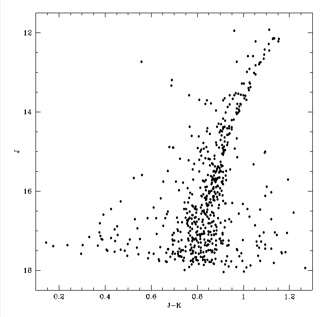 이 색등급도는 J 및 K 밴드에서 이 천체 무리의 근적외선 이미지를 사용하여 제작되었다. J 밴드 등급은 y축을 따라 표시되고, J에서 K까지의 지배적인 색상은 x축을 따라 표시된다. 이러한 다이어그램은 혼잡한 필드 측광을 위한 특수 코드로 빠르게 만들어진다.[7]