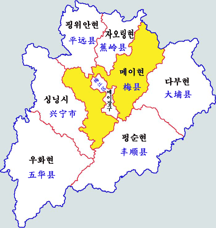 1965년 | 메이현전구(梅県専区) (이후 메이현지구) | 메이현, 다푸현, 펑순현, 자오링현, 핑위안현, 흥닝현, 우화현 | 7개 현 |