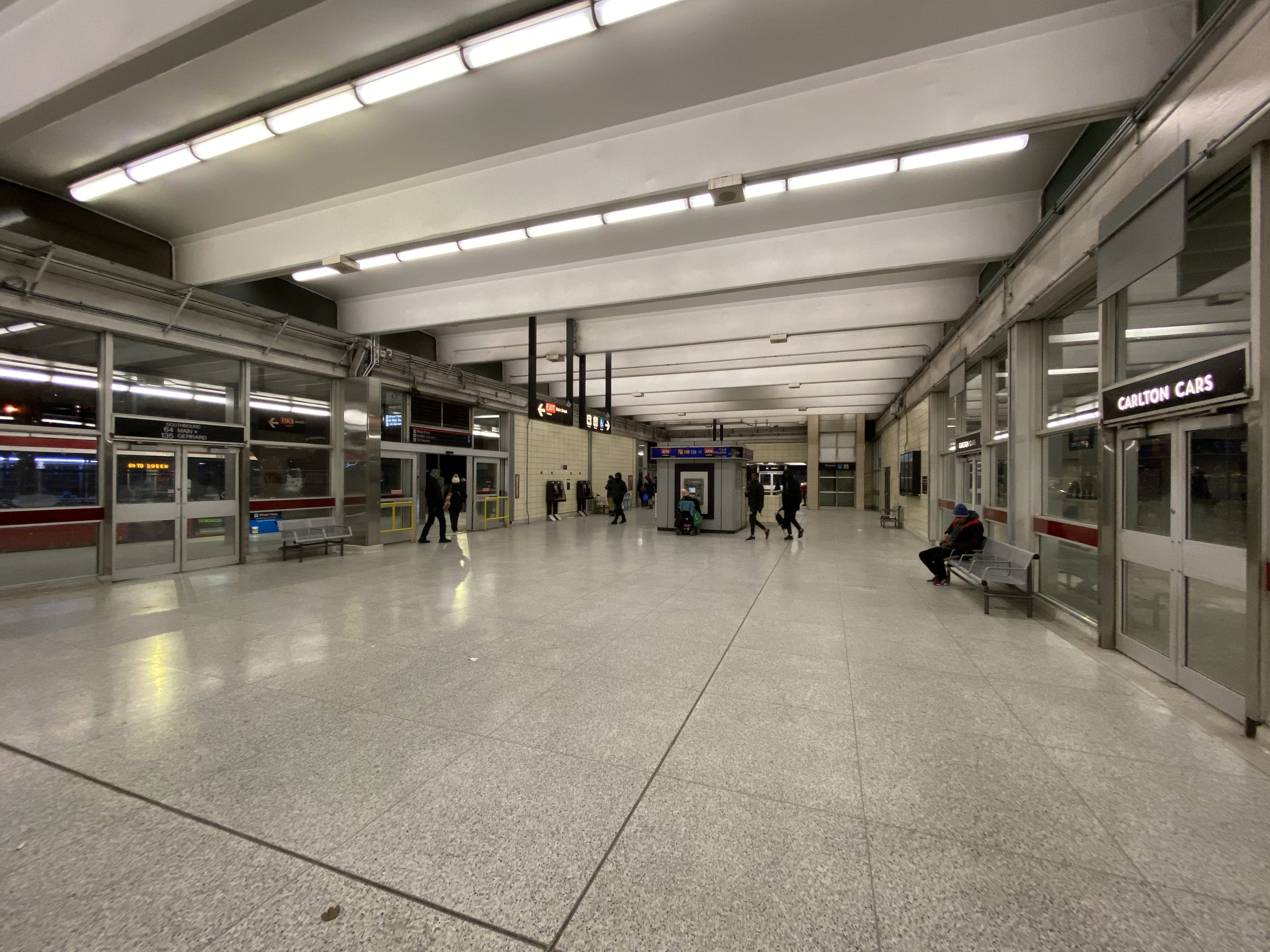 TTC 역은 대략 직사각형 모양이며, 도로 층, 콘코스 층, 승강장 층의 3개 층으로 구성되어 있다. 도로 층에는 버스 정류장, 노면 전차 승강장 및 요금 징수대가 있다. 역 건물 북쪽과 동쪽에 5개의 버스 정류장이 있으며, 건물 남쪽에는 506 칼턴 노면 전차(야간에는 306 칼턴)의 동쪽 종점으로 사용되는 건물을 시계 방향으로 도는 노면 전차 루프 안쪽에 단일의 긴 노면 전차 승강장이 있다. 버스 정류장과 노면 전차 승강장은 요금 지불 구역 내의 요금 징수대 뒤에 있다. 콘코스 층은 2개의 마주보는 계단으로 연결되며, 도로 층으로 올라가는 일방향 에스컬레이터가 있다. 콘코스 층에는 게이트웨이 뉴스 가판대가 있다. 콘코스에서 콘코스 층의 북쪽과 남쪽에 있는 2개의 마주보는 계단이 승강장으로 연결되며, 두 승강장 모두 콘코스로 연결되는 일방향 에스컬레이터가 있다.