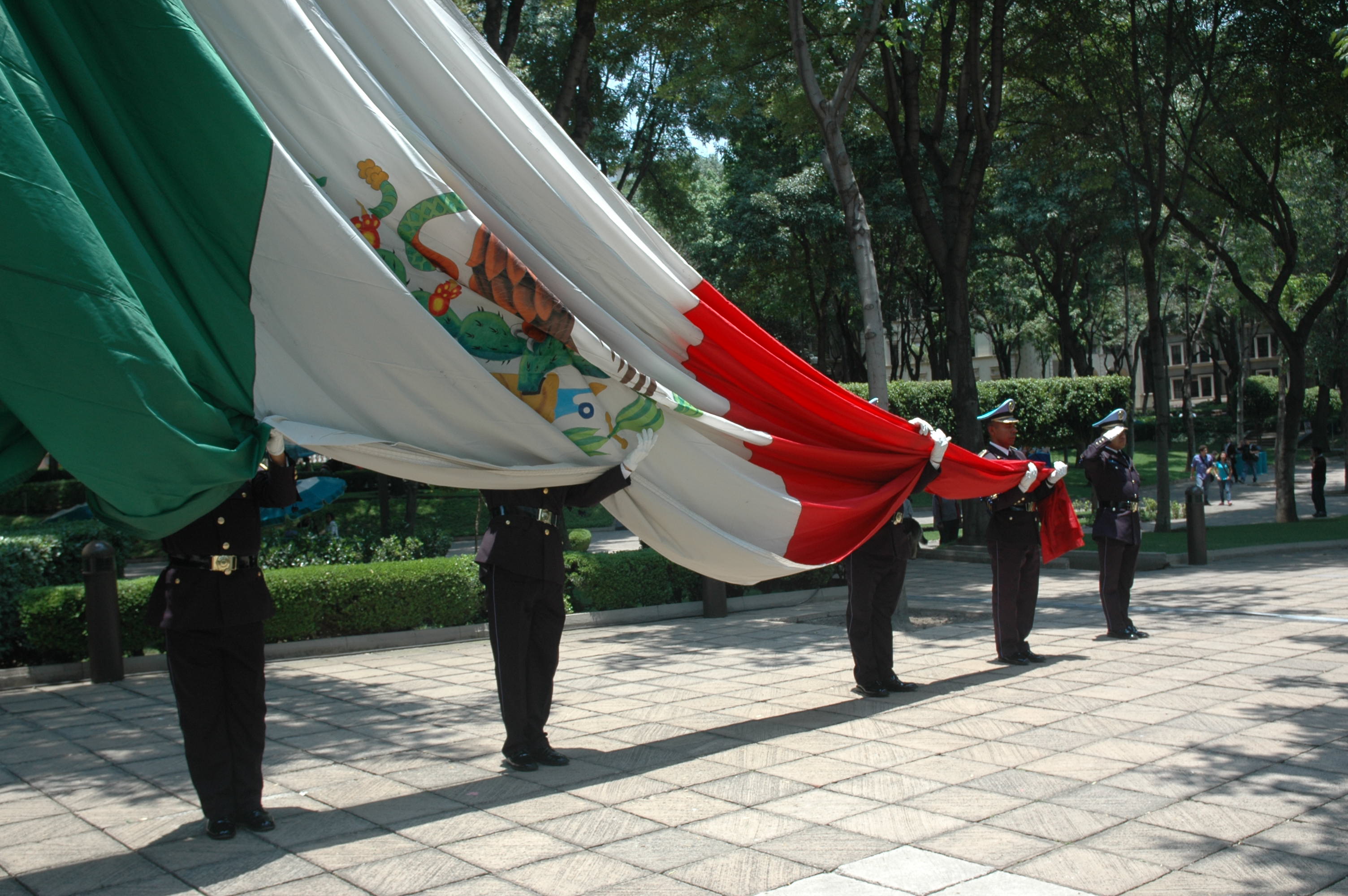 소집: | 시민 여러분: 저는 멕시코를 대표하여 여러분의 애국심에 이 국기를 위탁합니다. 이 국기는 멕시코의 독립, 명예, 기관, 그리고 영토의 통합을 상징합니다. 여러분은 이 국기에 충성, 애국심, 그리고 굳건함으로 영예를 돌리고 지킬 것을 서약하십니까? |